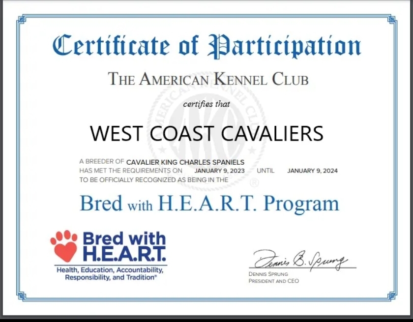 West Coast Cavaliers reports to performing the health tests below on their breeding dogs. Ask your breeder about the tests performed on the parents of your litter. Learn more about health testing for Cavalier King Charles Spaniels.