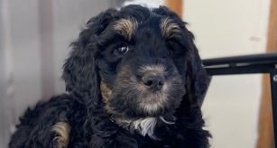 Jyn is an F1 Bernedoodle with an excellent demeanor. She’s an attentive and loving mama and in perfect health. She smiles a lot and loves loves! Her favorite things are car rides, belly rubs, and holding hands (sometimes holding hands on a car ride). She is nearly three years old (born Fall of 2019).