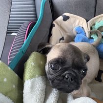 Her registered name is Karma Choice Bit Of Hotsy Totsy but we call her Belle. She a AKC registered female. Belle is a gorgeous Pug, she is black with highlights of Platinum and Brown. Belle comes from an exceptional Pedigree
