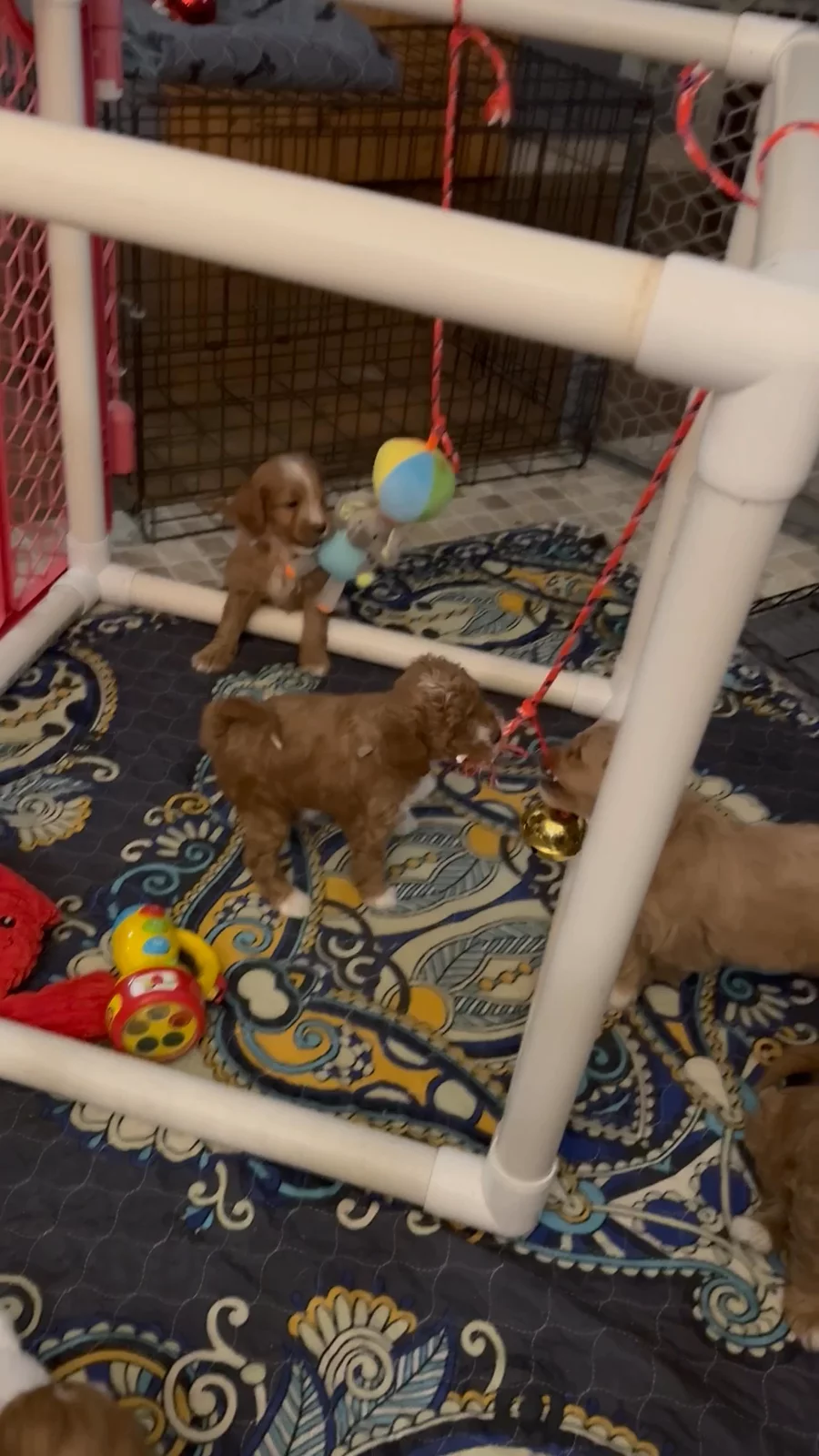 Puppies have an open door crate in their play area for them to go in amd out of on their own, this helps them transition easily to homes that wish to use crate training. Bluey is still hanging around, he is 8 weeks and 3 days old 😊. He’s literally a perfect puppy! Reach out with any questions.