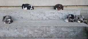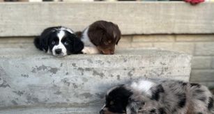 Our puppies include black tri, blue merle, red merle, and red tri. Colors will vary depending on the parent dogs.
