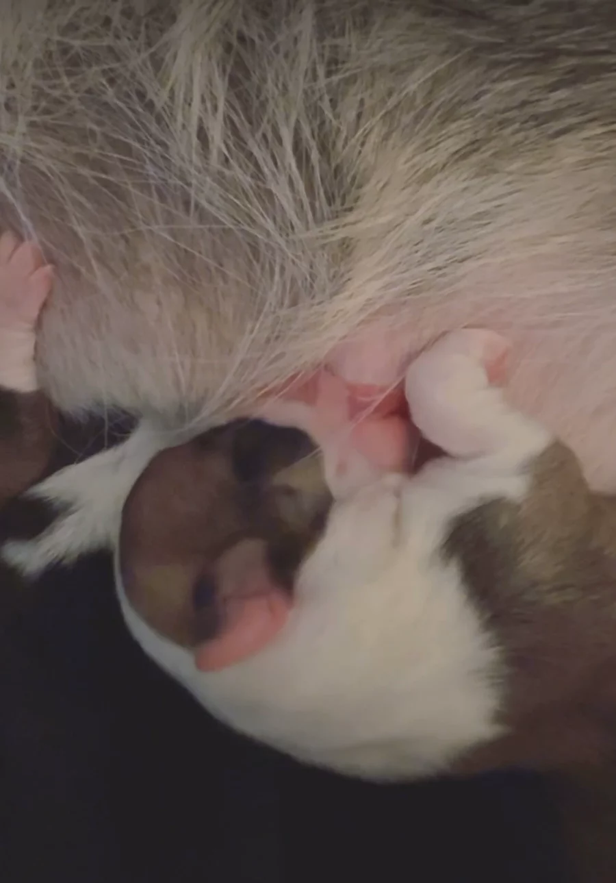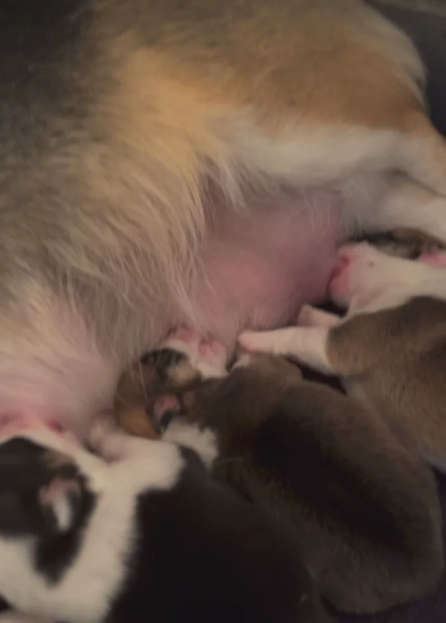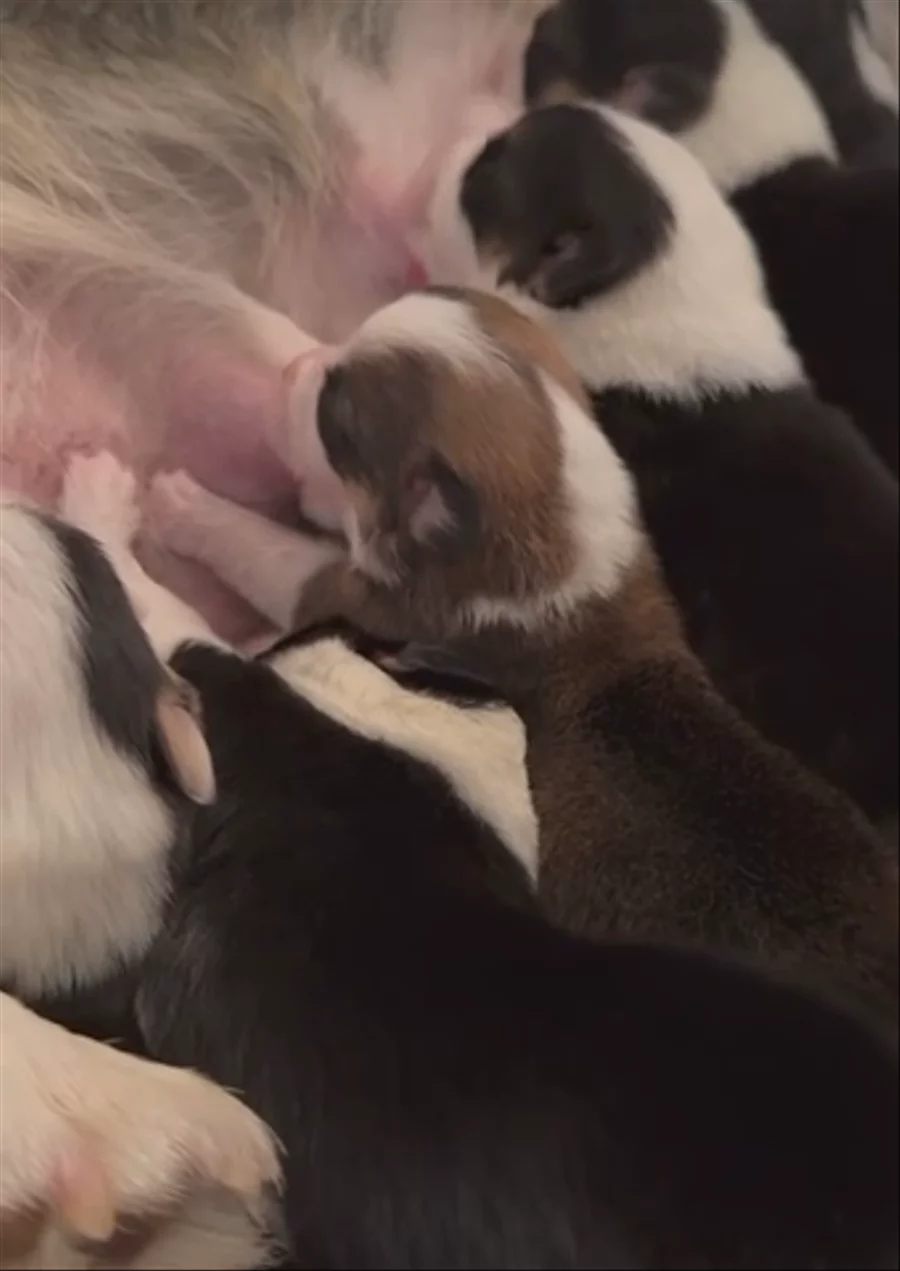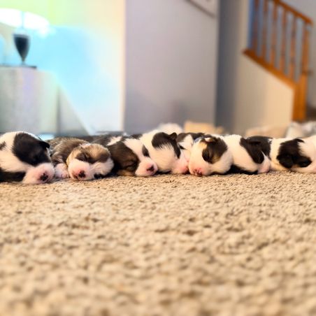 Some may notice that these babies are significantly darker than our last ones! That is because the majority of these babies will look like Tato 🥔! We specifically chose a male that carried the Tri gene to have Tri colored babies and we couldn’t be more excited! Don’t worry, there’s still 2 little Red & Whites in there!!