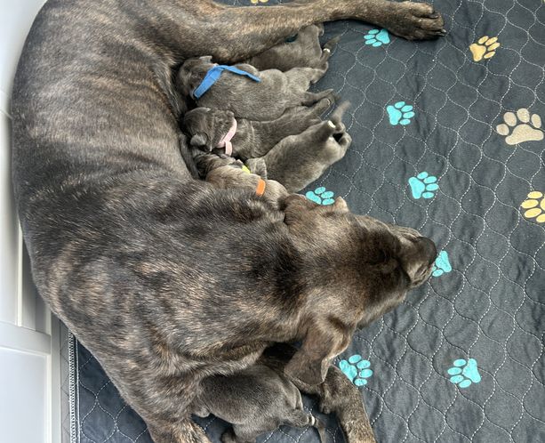 Our puppies include gray and fawn, chestnut brindle, black, black brindle, fawn, gray, gray brindle, and red. Colors will vary depending on the parent dogs.