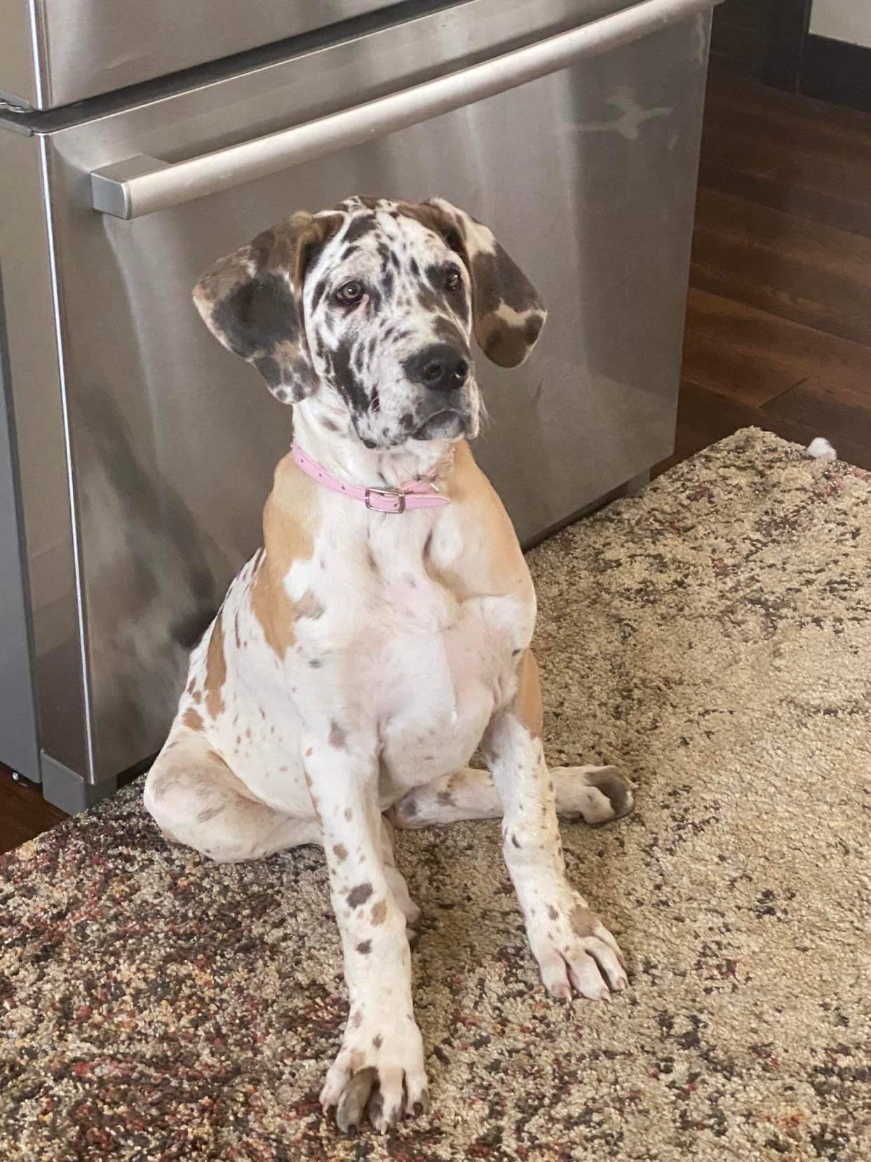 Nala is a little higher energy female. Loves kids and other animals. She is a silver harlequin.