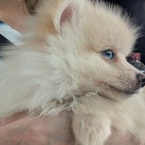 Junior is one of our own coming from Merle and Tootsie. He is a cream merle with blue eyes. He has very thick healthy fur. He is very much an ideal representation of the Pomeranian breed. He comes from champion bloodlines.