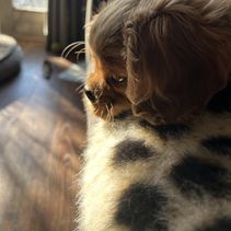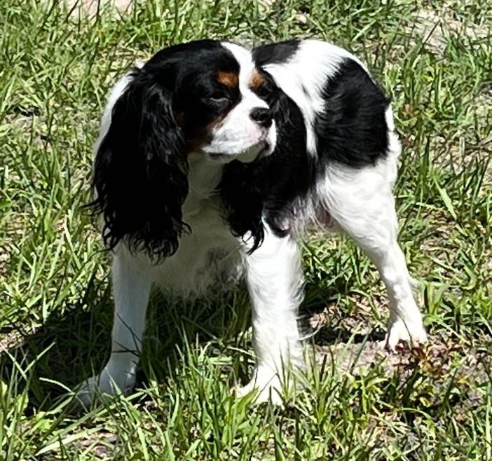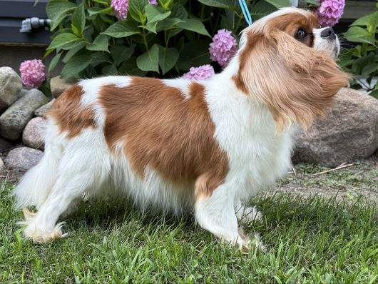 Dude is our new young show hopeful. He, himself is out Grand Champion Bonitos Companeros Sunny whose pedigree is backed by strong show lines with healthy pedigree. His bottom side is impressive packed with quality and champions as well. He is currently out prepping for his show career and we couldn't be more excited about him and what the future holds. He has the classic sweet, loving and wants to please Cavalier personality. As you an see in his everyday profile picture his stature is within the standard Cavalier requirement. He knows he is a pretty special boy. Although he is young in this photo you can see his conformation is spot on in just free form.