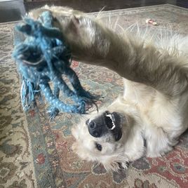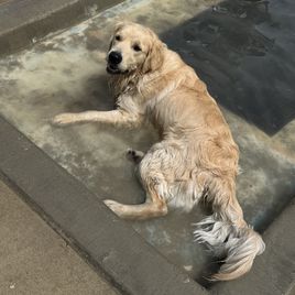 Henry is a lovable, caring, well behaved, gentle giant. He is a favorite of Iowa State University's veterinarians due to his calm, quiet, gentle, lovable demeaner and how easy he is to handle and interact with even during testing, vaccinations, and breeding. Henry has an outstanding AKC English Cream Golden Retriever pedigree and could be shown, but we just consider him part of the family. He listens well and learns quickly, going with us wherever we go around the farm, for long distance or short drives, for a walk or run, to play in the water or on the beach, you name it! Henry adores fetching his ball, exploring, splashing in his pool, and interacting with us, but also loves just relaxing on the cool floor or on his thick plush dog bed, laying by your side, in your lap, or on the bed while we work or relax. Henry is one that wants to please and will do just about anything you ask him to! Henry adores belly rubs, having his chest rubbed, and gentle rubs on his ears or cheeks. He smiles and snores admiringly when you do so! Henry is one of a kind!