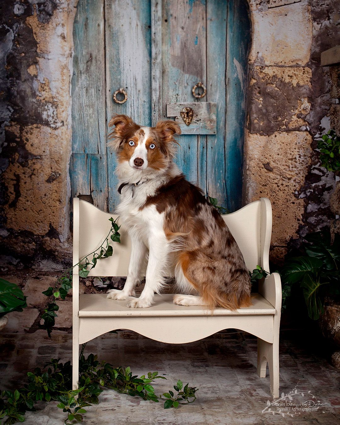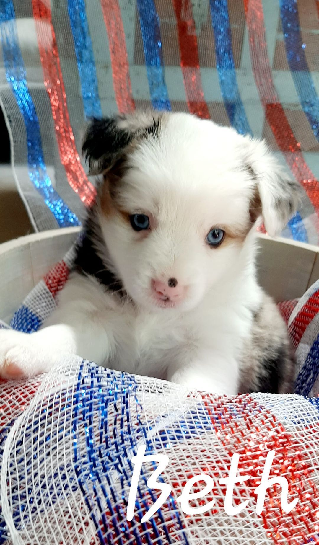 Sweetest girl in the world. Loves to please. Very athletic. Loves herding and running VERY fast. Gorgeous double blue eyes. A mama's girl for sure. Lives in the house with our family. Also, raises her litters in our home.