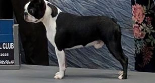 Tipps is another fine example of the Boston terrier. She is black and white. Impressive pedigree with a lot of Champions. Tipps loves everyone she meets. Tipps eyes, hearing heart and Patella's are all clear.