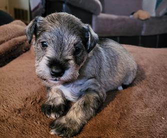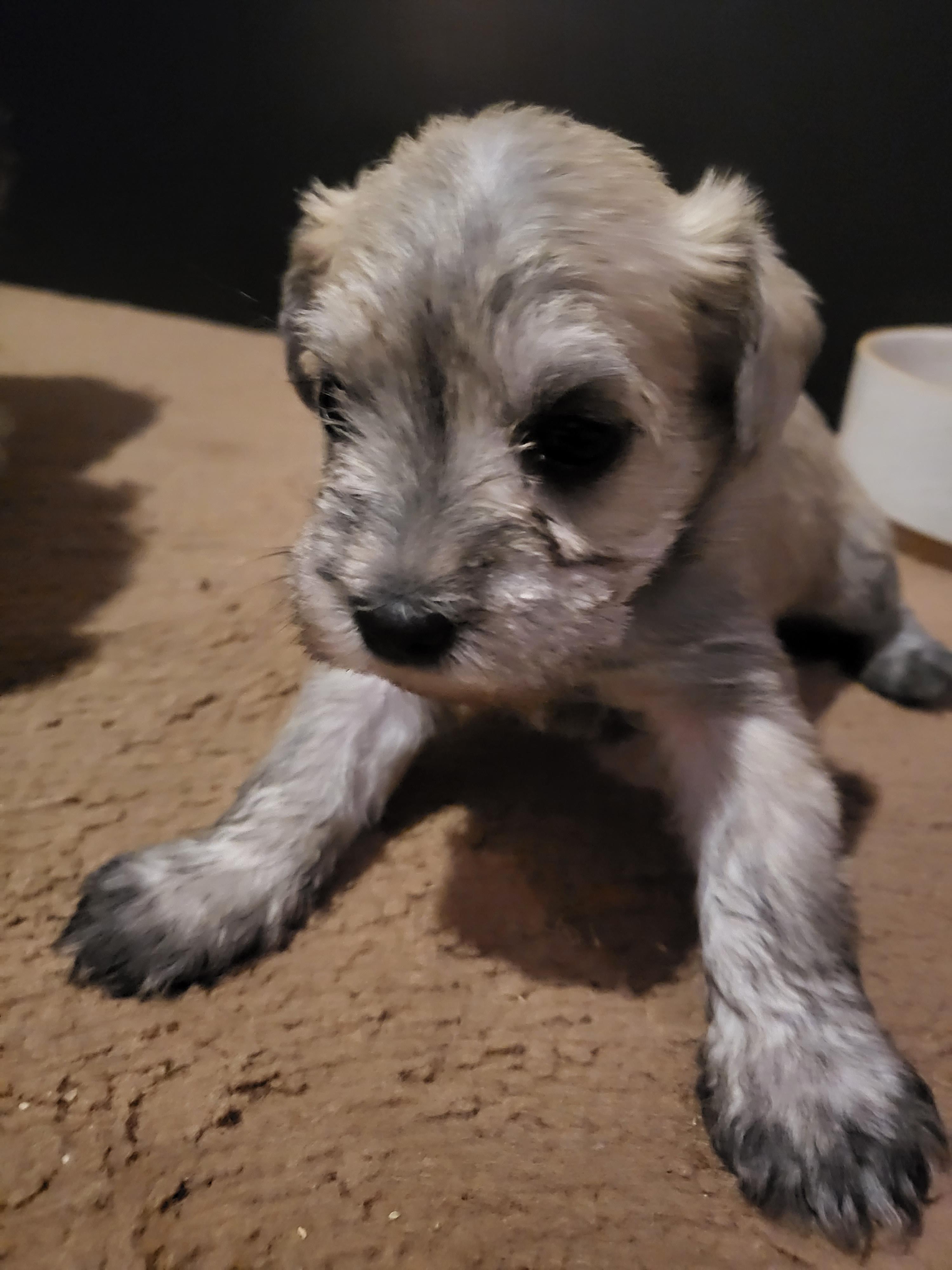 Our puppies include salt and pepper and black and silver. Colors will vary depending on the parent dogs.