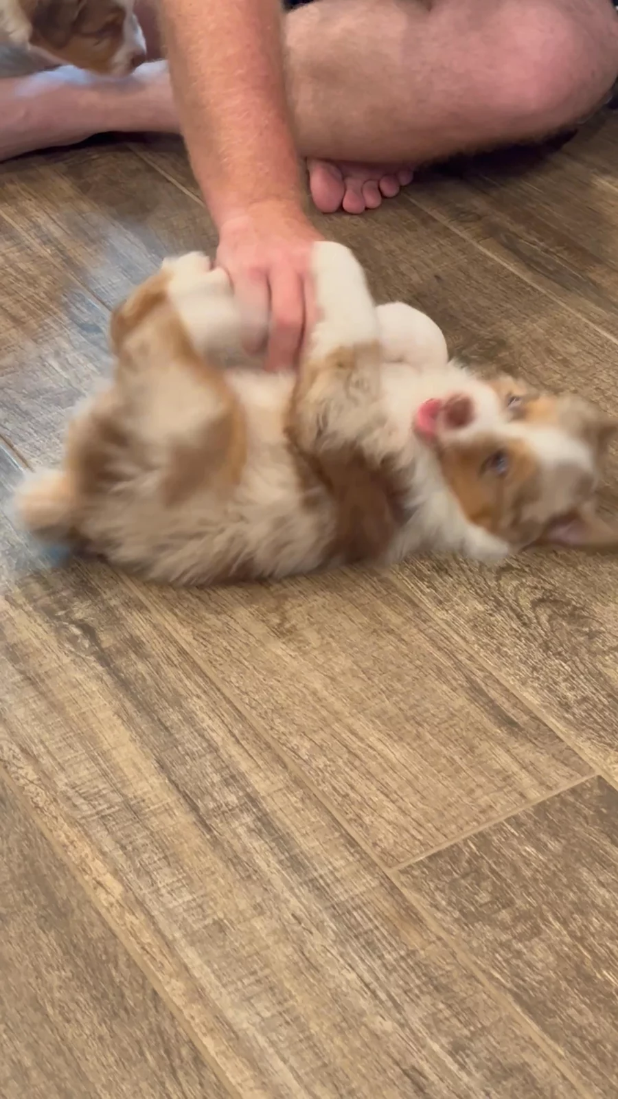 I'm Stacey-Anne S., the breeder behind Wiggle Butt's located in Palm Bay, FL. Ava the chill queen with a surprise burst of bonkers, and Remy the non-stop rodeo show! 🤠🐶 Ava gives you those soulful “I know everything” eyes. Ava is the striking with that classic Blue Merle, Remy, our Red Tri with crystal blue eyes, that steals your soul.
