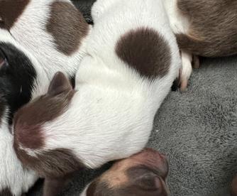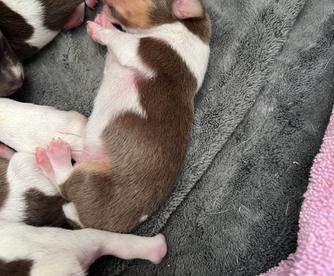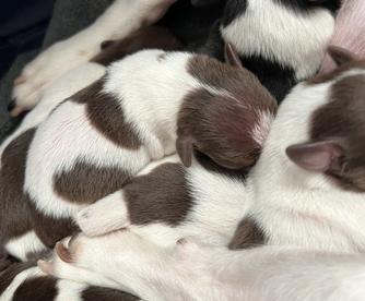 Our Teddy Roosevelt Terrier puppies are chocolate and white. Miniature American Shepherd puppies include black tri, red tri-color, red merle, and blue merle. Colors will vary depending on the parent dogs.