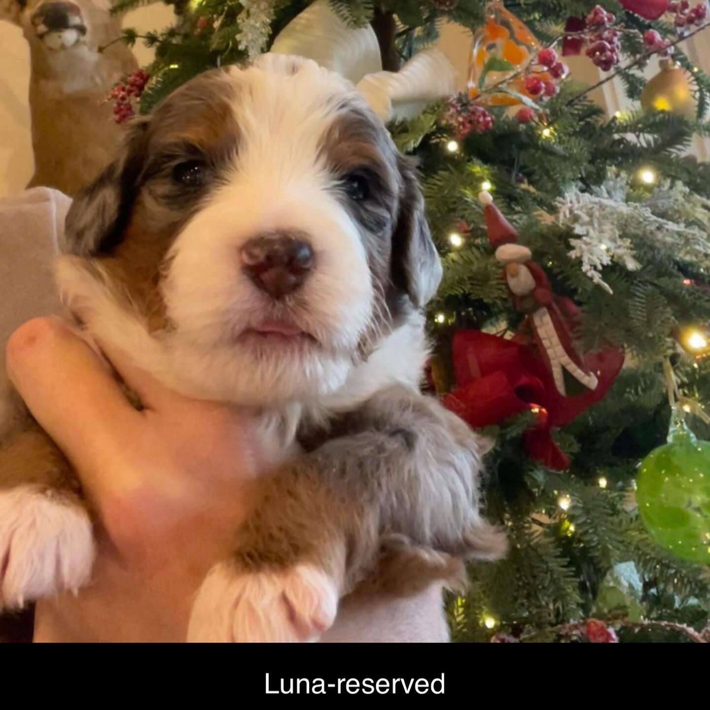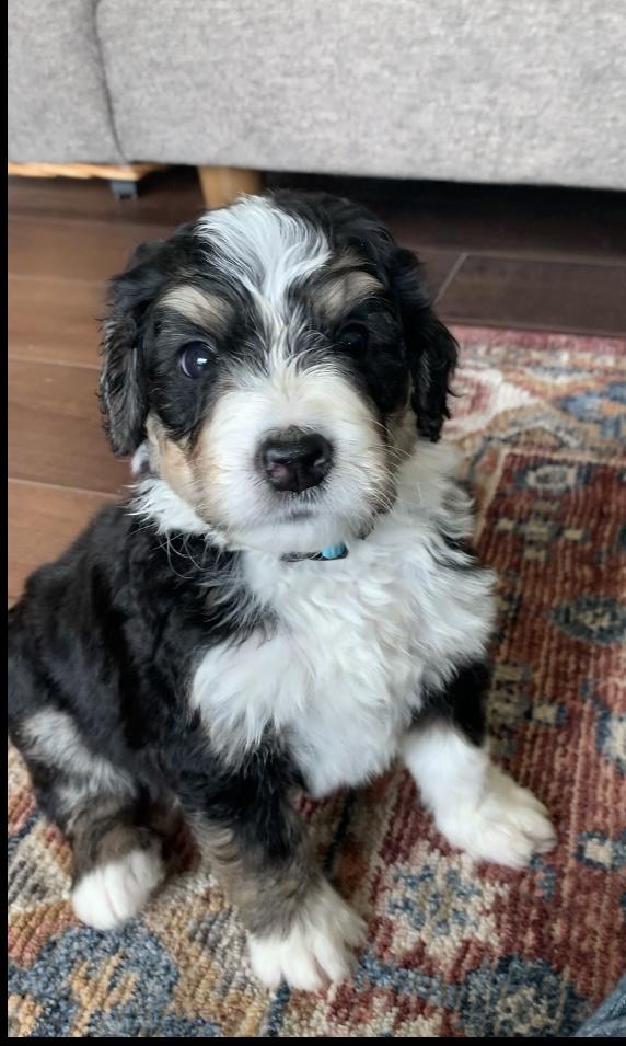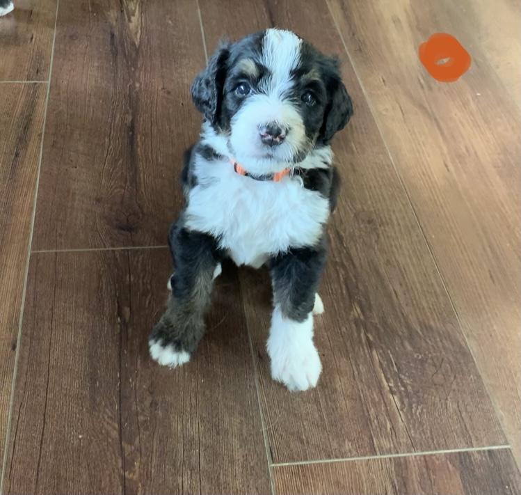 Our Bernese Mountain Dog puppies are black rust and white. Bernedoodle puppies include tri-color and merle. Colors will vary depending on the parent dogs.