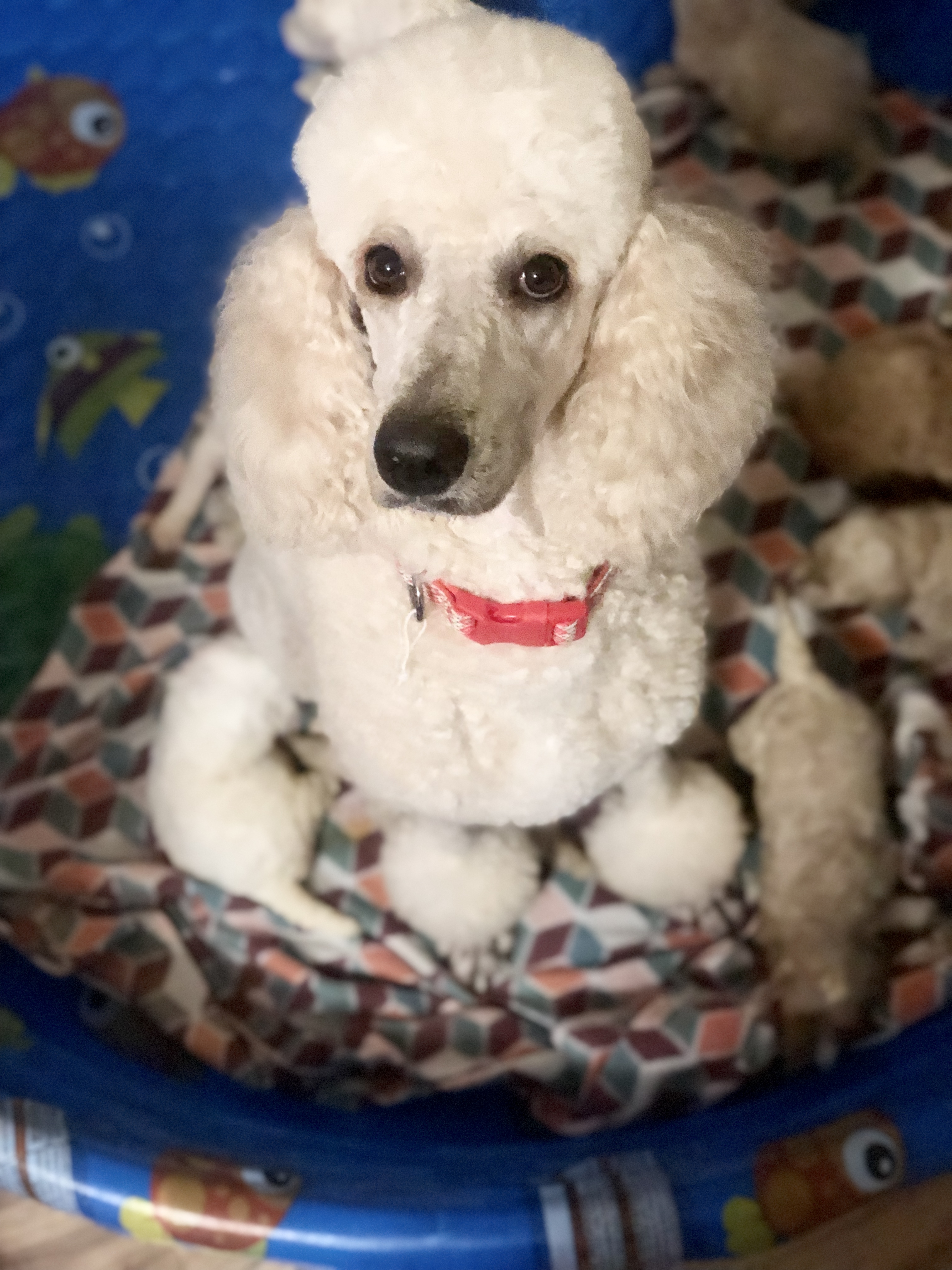 Our first litter of Standards was born in 2021 but we have over 15 years of experience raising and caring for litters. Finally making the investment and diving in to our own breeding program was the best decision we have made. I (Kendra/mom) am the primary caregiver to our pups. As a former vet tech and now stay at home mom, I have the privilege of handling and caring for each puppy in our home.