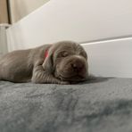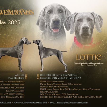 Lottie is a spunky girl with such a beautiful disposition about her. She officially earned her UKC Championship title in March of 2023 and continues to impress us in the UKC ring with bringing home another Group 1 in the June show. Lottie completed two levels of obedience training at an early age and has since gone on to earn her AKC Canine Good Citizen(CGC), Virtual Home Manners-Adult(VHMA), and Trick Dog Novice(TKN) titles. She has been started on birds and is showing promise to be a great bird dog by having already lead us to countless wild birds while out in the fields. Lottie completed her third season of big game recovery tracking and has several successful stories of recoveries. She also received her level 1 certification for big game recovery. She is a mellow Weimaraner with an easy going temperament and is friendly with both people and other animals. She loves to explore and run, but is also great at turning off the "Go" switch and will happily lounge around the house on a busy day. She has a mid-level of prey drive and is happy to look for a bird on command and works hard to use her nose to pick up the scent. She generally hunts within 50-75 yards of my hips so her style is geared more towards a hunter who want a closer ranged dog. The distance has and can be built through proper training and exposure. Lottie will be thoroughly genetically and health tested prior to any breedings. We are focusing on learning more about her in both her positive attributes and in her short comings to help us properly select the correct male to compliment her.