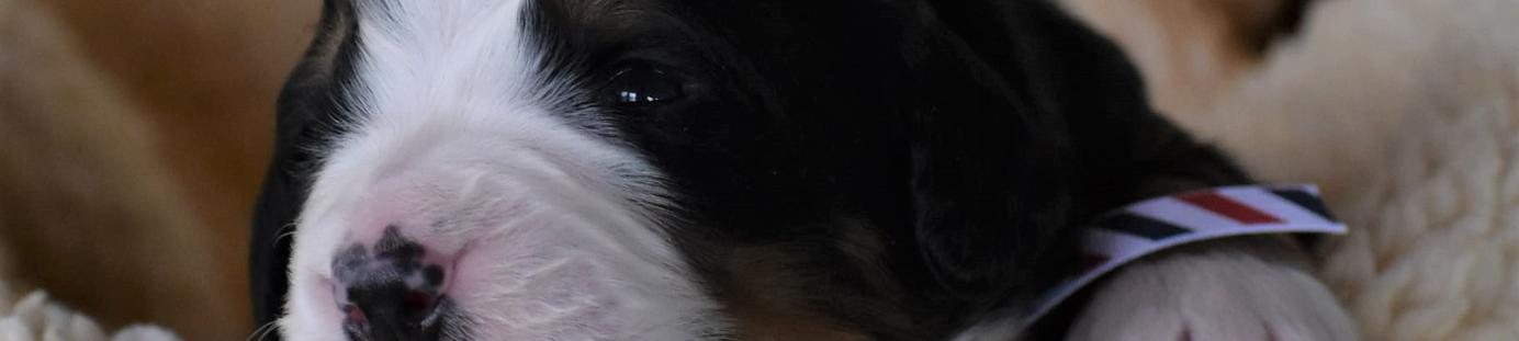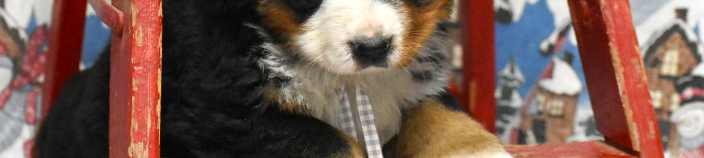 Tikka is a sensitive, affectionate girl who would live every minute right by our side, if she could. A blocky build and wavy coat add physical beauty to her beautiful spirit. Tikka's dam was our girl, Daisy, and her sire, Gunnar, was one of our very first Berners. He lived to 11 yr. old and had excellent longevity that we are hoping will be passed on through Tikka. He was also our certified Therapy Dog and has definitely passed on that sensitivity to Tikka. Tikka has great health testing results and has proven herself to be a great mom to her puppies.