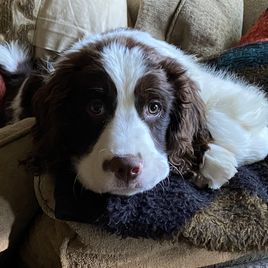 Tua is my shadow. I often describe springers as velcro dogs and he is most definitely the perfect example. He loves his people! He had a successful show career with AKC and is an International Champion as well as being handled as a juniors dog before covid. He passes on his amazing personality and good looks to all of his puppies.