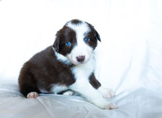 Our Border Collie puppies are white and red. Pembroke Welsh Corgi puppies are sable. Colors will vary depending on the parent dogs.