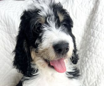 Our Aussiedoodle puppies include brown and white, blue merle, red merle, black phantom, black and white, and black tri-color. Bernedoodle puppies include black and white and tri-color. Colors will vary depending on the parent dogs.