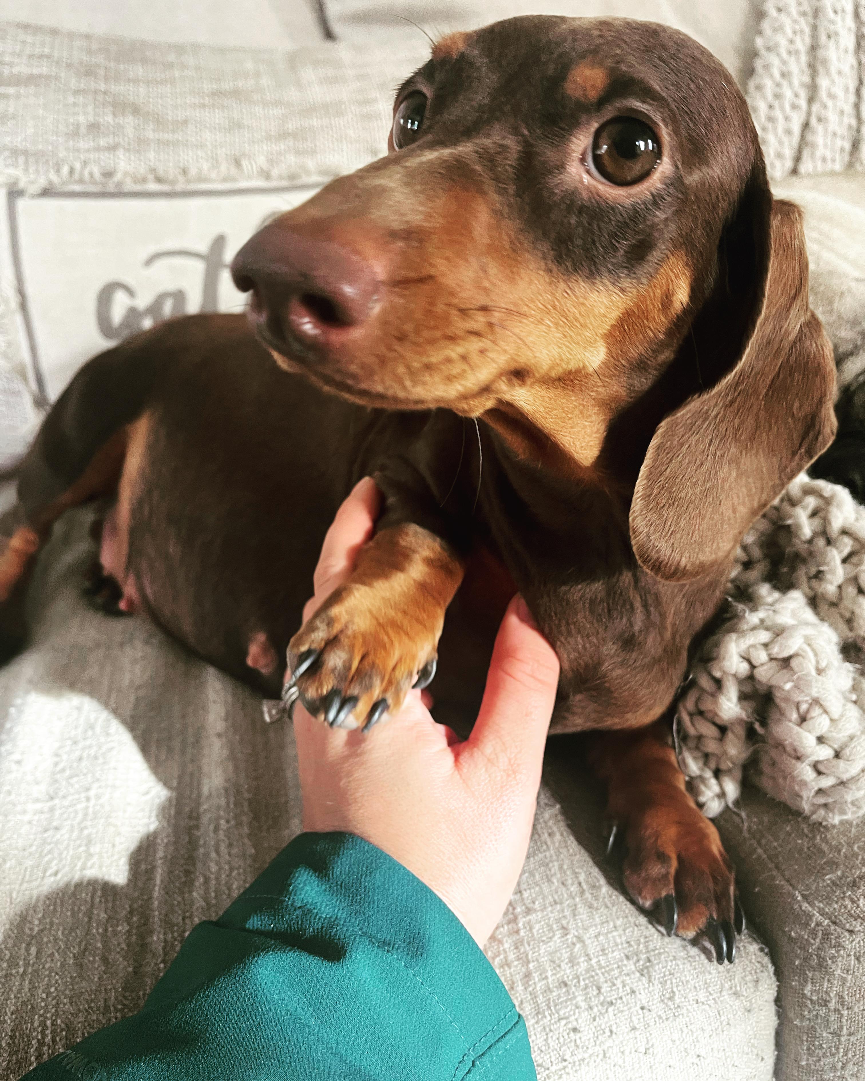 Stella is a female Dachshund. Carefully selected as a great representative of her breed, Kate decided to make her part of their program. Kate has passed Good Dog’s screening process, which involved a review of their breeding practices, environment, and the mental and physical health of their dogs.