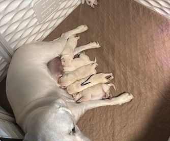 Lily’s puppies are growing by leaps and bounds and are 3-weeks old today! They are all weighing in from 3.10lbs to almost 6, their eyes are open, they are toddling all around and learning how to use the pee pad, and their ears are open.