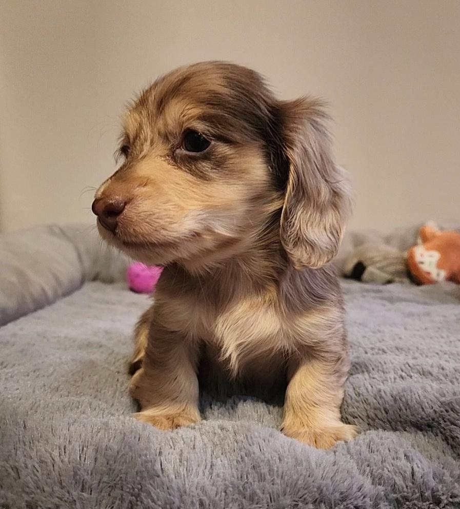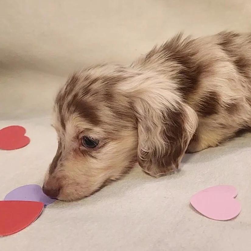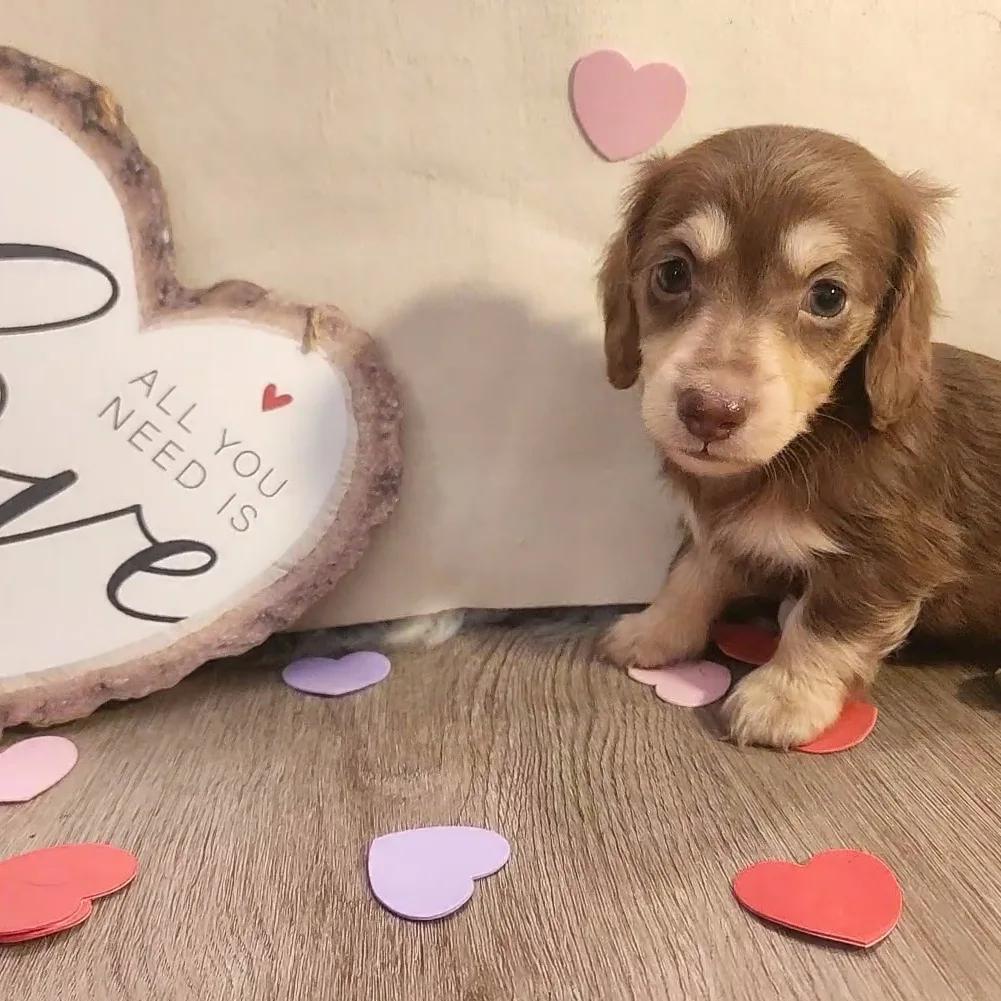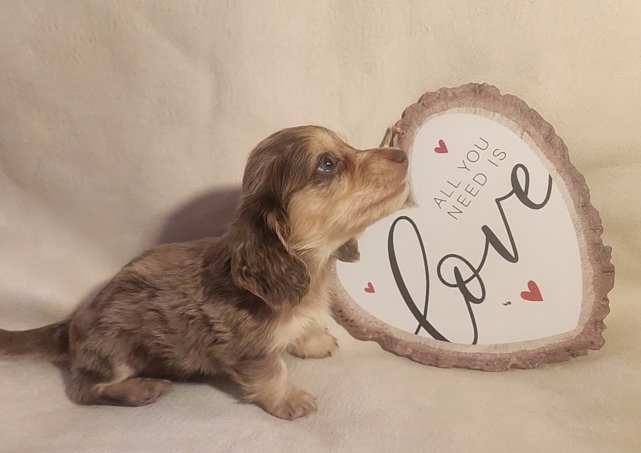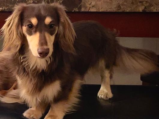 Remy is a chocolate and cream longhaired mini dachshund. He is my adult daughter's forever dog, and the love of her life. He was raised in a dorm, and is very social. He is gorgeous and enjoys being spoiled on his many adventures! There is something about boy dogs keeping their puppy love and loyalty, and he certainly does!