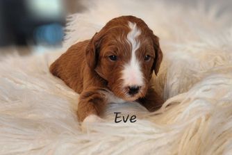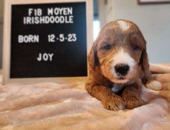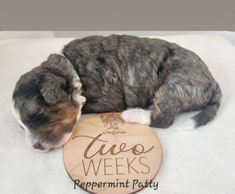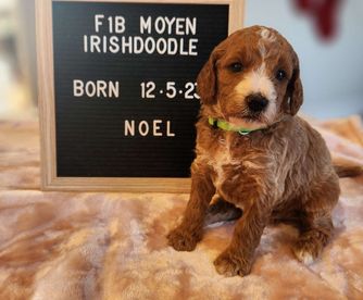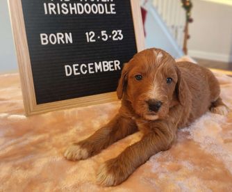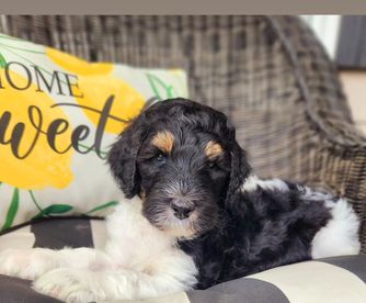 Our Bernedoodle puppies include black and white, tri-color, phantom, and merle. Irish Doodle puppies include apricot and red. Colors will vary depending on the parent dogs.