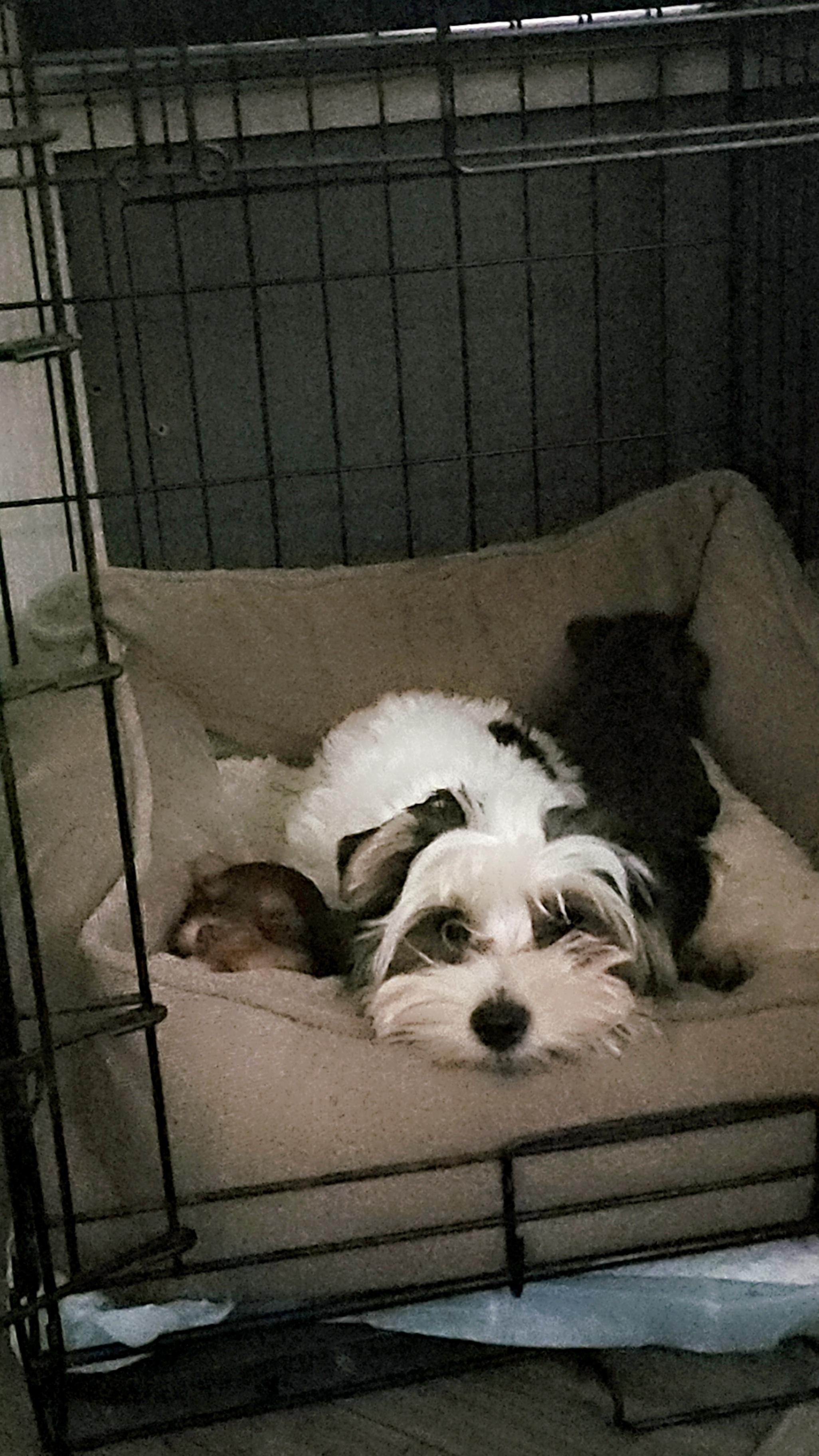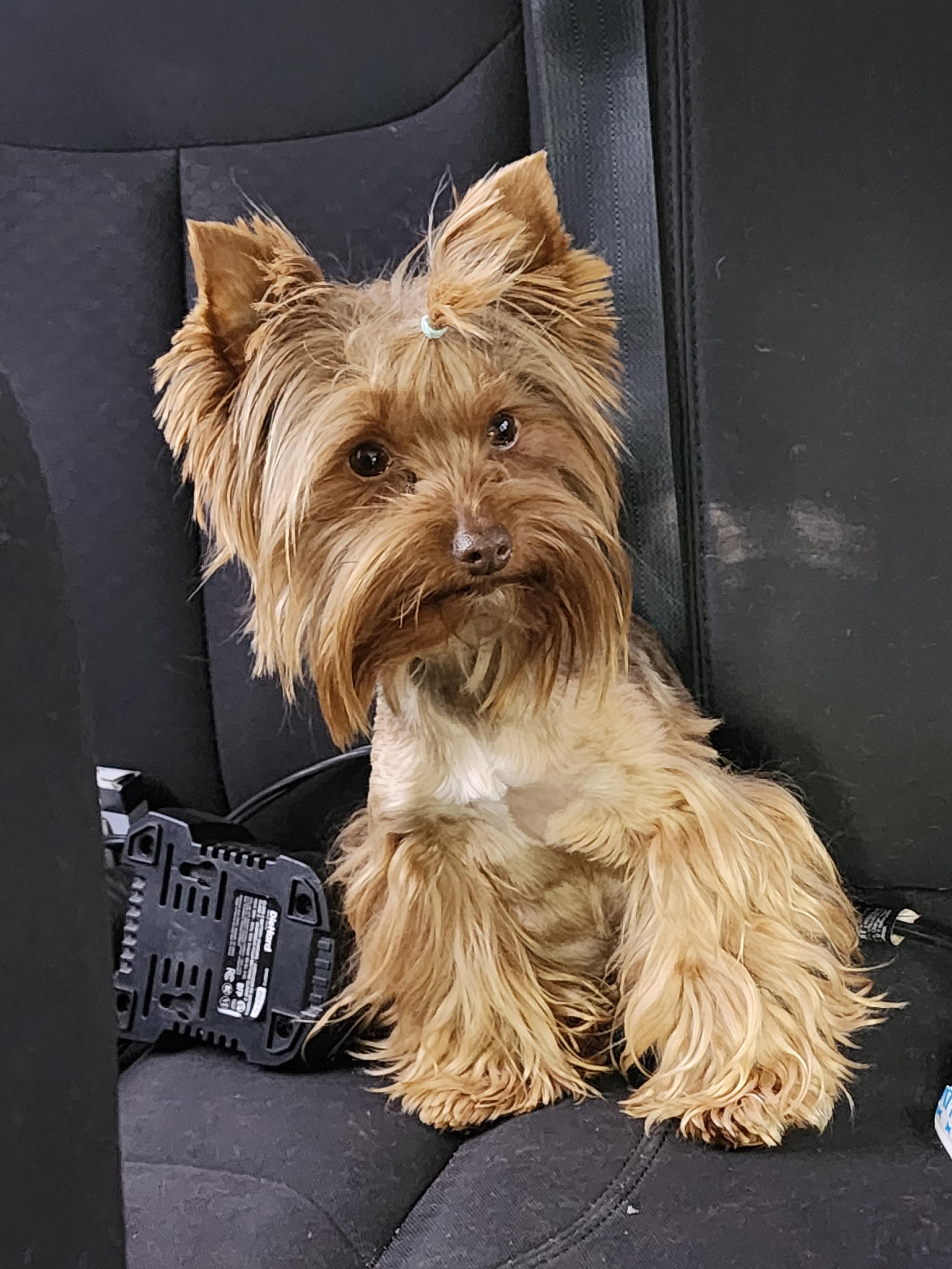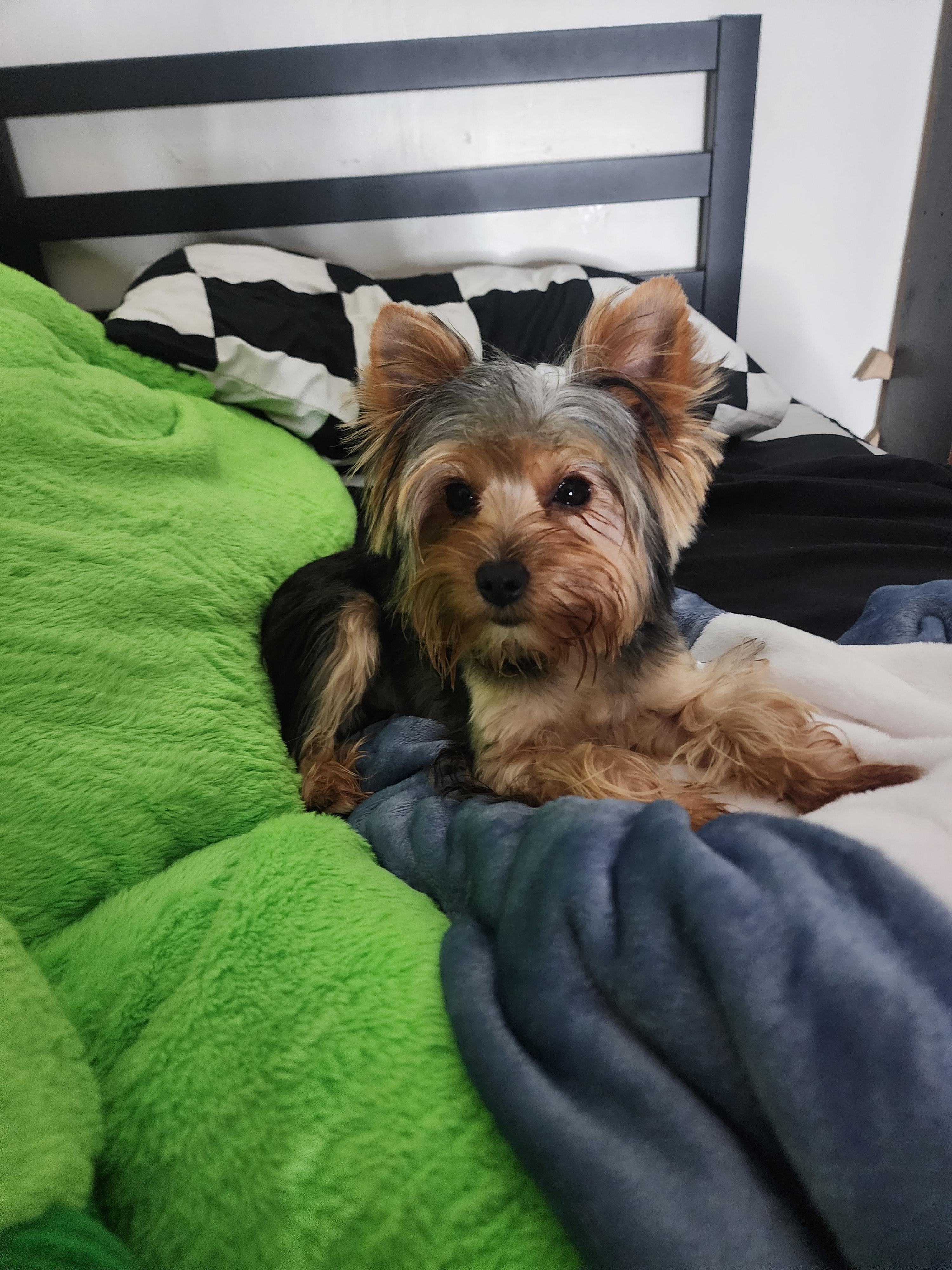 Miley is a spunky little girl! She is all sass and thinks she runs the house! Miley is girly and loves her bows and clothes, she prances everywhere she goes and think everyone is her best friend. She is very smart and eager to learn new things. Her favorite thing to do is to be curled up to my husband (who swore he wouldn't get attached to these little dogs). Miley is the absolute BEST momma and has required little to no help with her babies. She makes sure everyone is clean and well fed all day! Miley is a chocolate and tan yorkie. Her babies are sure to be your new best friend!