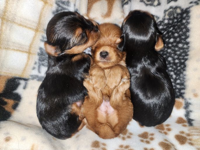 Our puppies include gold, chocolate, tan and white, chocolate and tan, parti, blue and gold, black and tan, and black and gold. Colors will vary depending on the parent dogs.