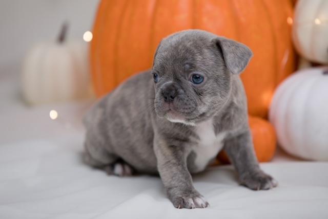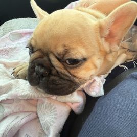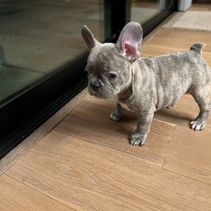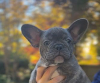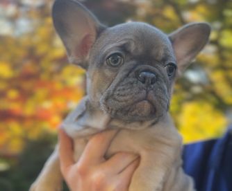Meet Josie, a stunning lilac French Bulldog with a personality as vibrant as her unique coat. Her soft, pastel hue is complemented by striking blue-gray eyes that sparkle with mischief and affection. Josie is playful and curious, always exploring her surroundings and making new friends. With her charming bat ears and adorable wrinkled face, she captures hearts effortlessly. Josie loves to cuddle and is happiest when snuggled up with her family. Her playful spirit shines during outdoor adventures, where she enjoys chasing after toys and basking in the sun. With her loving nature and delightful antics, Josie is a true joy to have around!