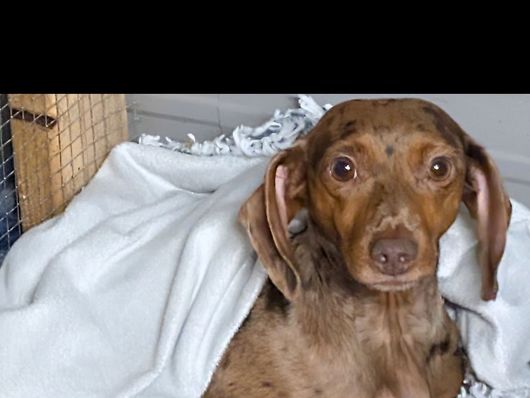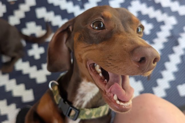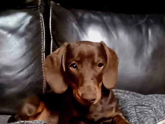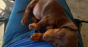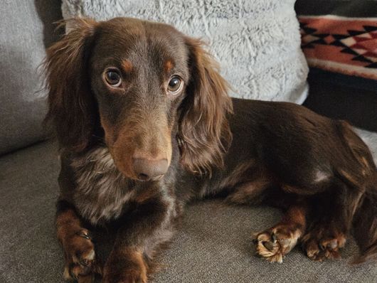 Handsome smooth haired chocolate dapple. He's Nash's dad. He's still very active and playful and a very sweet boy. Also can be pretty stubborn sometimes too!!