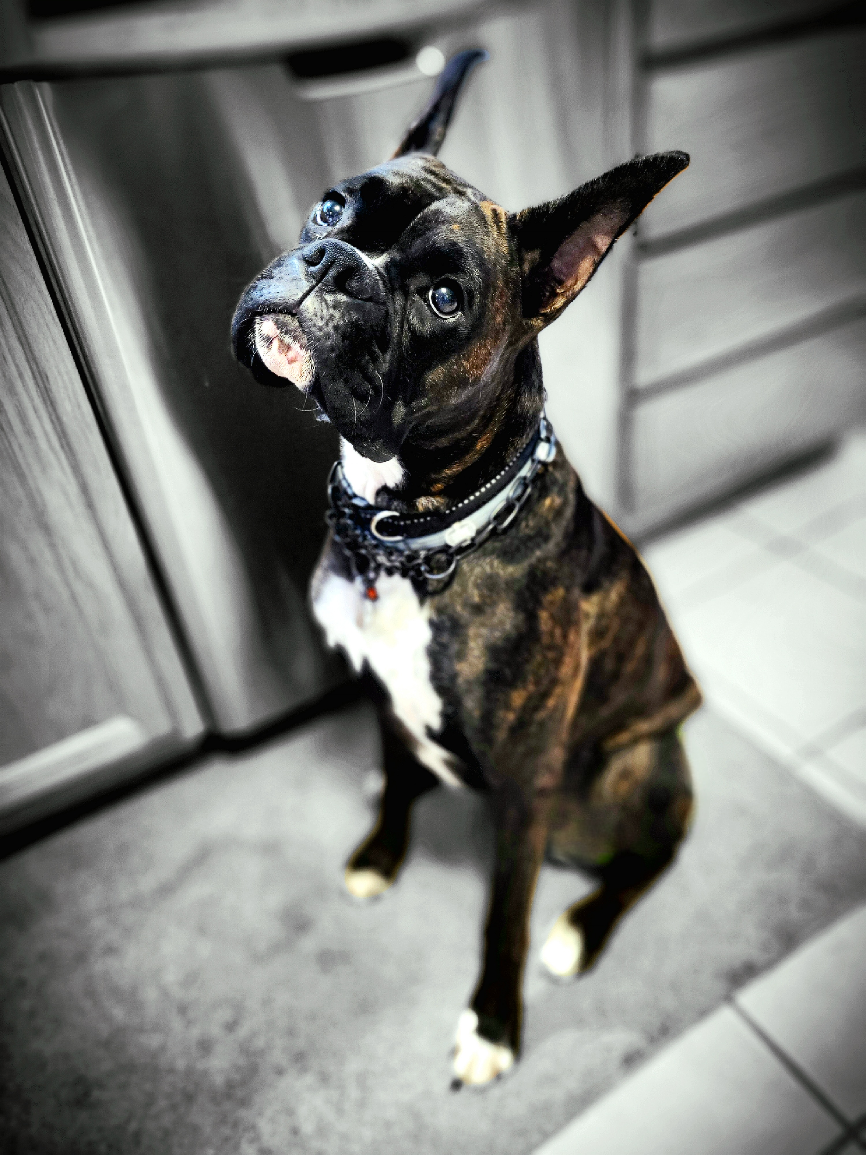 Kao is a male Boxer about 4 years old. Carefully selected as a great representative of his breed, AnnMarie decided to make him part of their program. AnnMarie has passed Good Dog’s screening process, which involved a review of their breeding practices, environment, and the mental and physical health of their dogs.