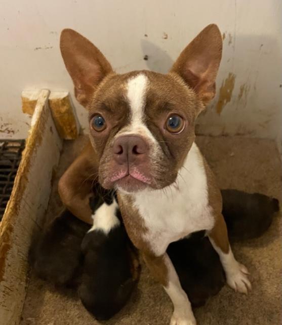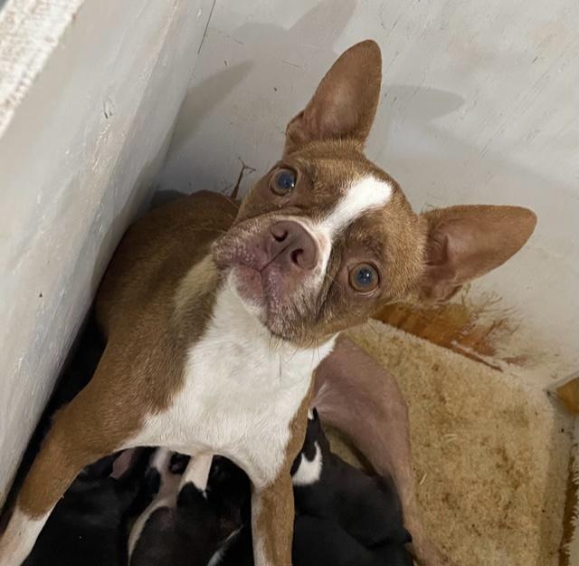 Esther is a female Boston Terrier. Carefully selected as a great representative of her breed, Tina decided to make her part of their program. Tina has passed Good Dog’s screening process, which involved a review of their breeding practices, environment, and the mental and physical health of their dogs.