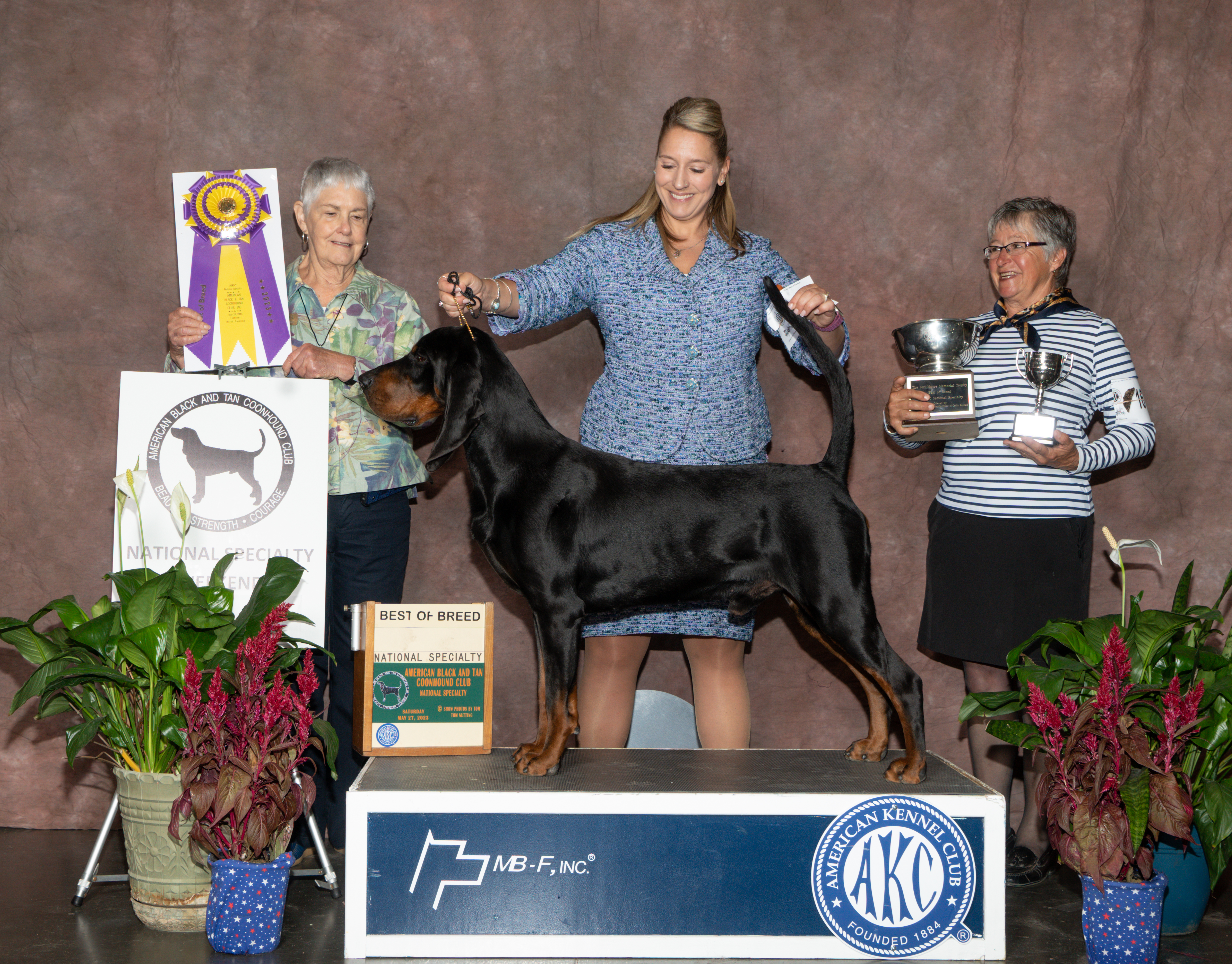 I regularly participate in conformation shows and started breeding to continue and improve on my line. My goal is to not only produce beautiful puppies, but to help promote responsible breeding in order to ensure that the Black and Tan Coonhound breed will continue to thrive for generations to come. These dogs have proven to be wonderful companions in my life, and it is a privilege to share that love and friendship with others.