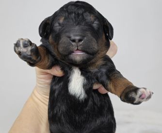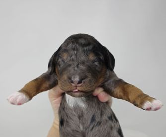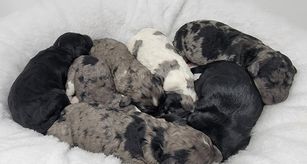 Our Bernedoodle puppies include black and white, tri-color, and blue merle. Goldendoodle puppies include cream, apricot, red, black, phantom, and parti. Colors will vary depending on the parent dogs.
