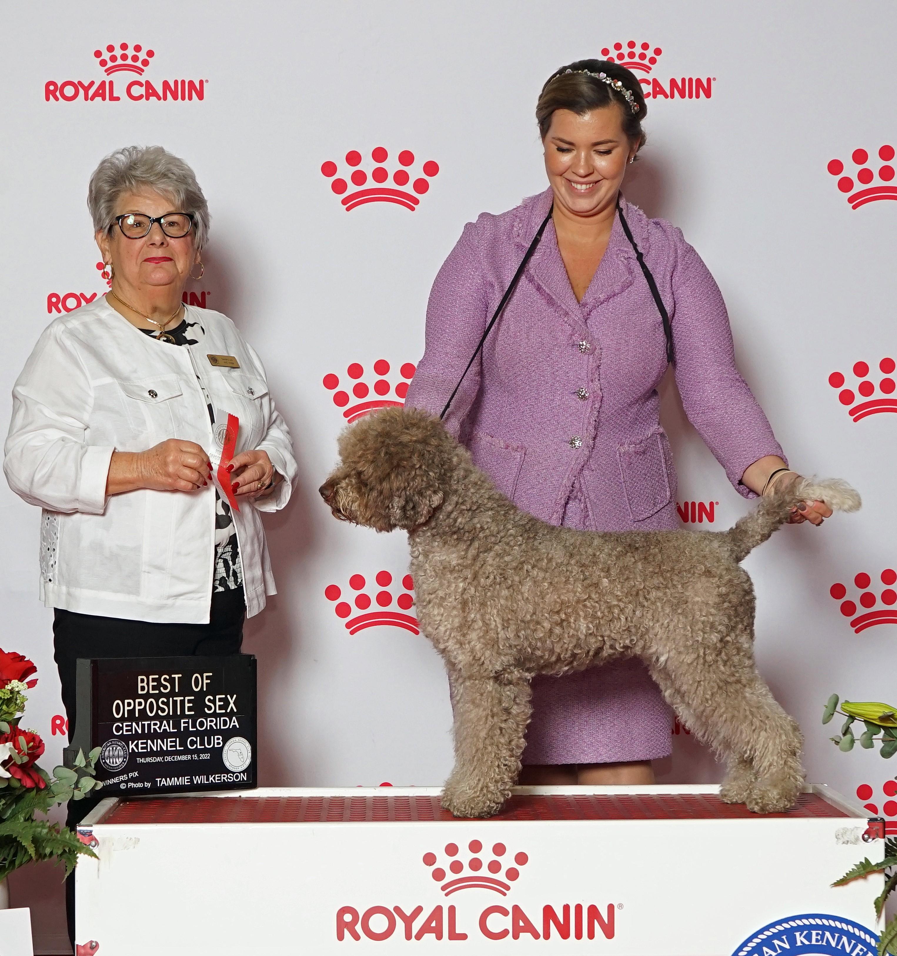 Rainey has been known as Ms. Perfect since she was a little puppy. Unlike most lagotto she did not get into alot of trouble. She is a Bronze grand champion and has titles behind her name so she is just not just a pretty face. She h as titles in dock diving, fast cant and comapnion dogs.