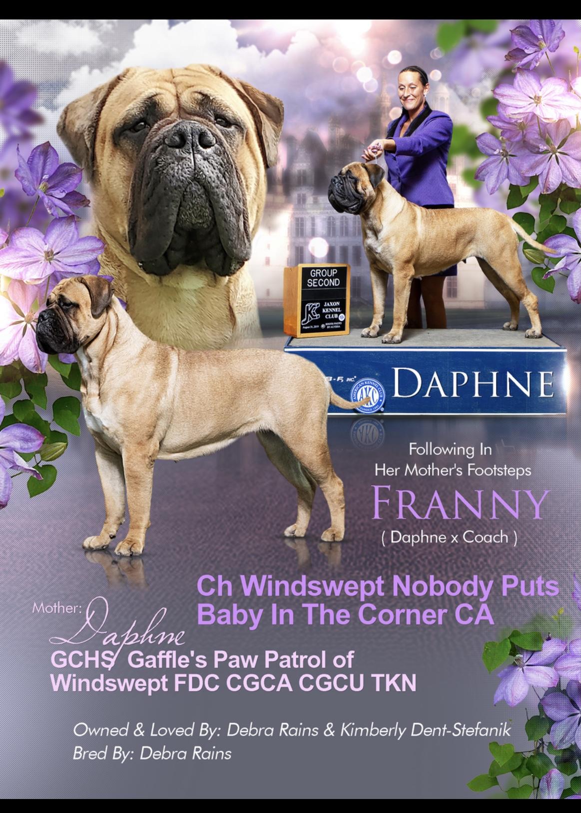 Daphne is a female Bullmastiff. Carefully selected as a great representative of her breed, Debra decided to make her part of their program. Debra has passed Good Dog’s screening process, which involved a review of their breeding practices, environment, and the mental and physical health of their dogs.
