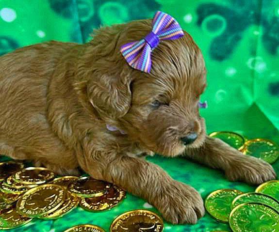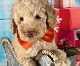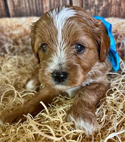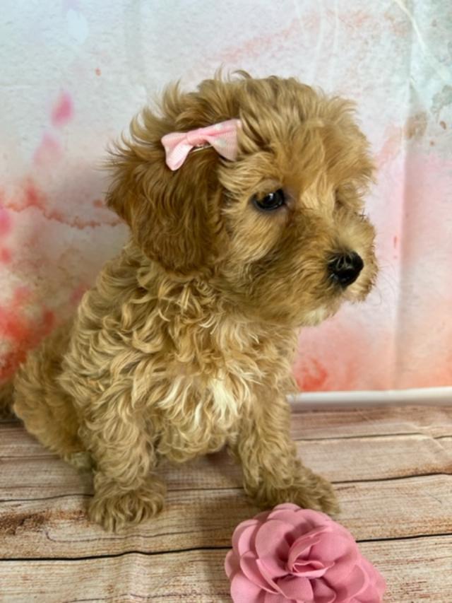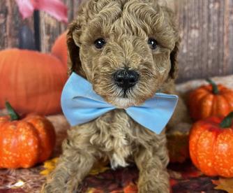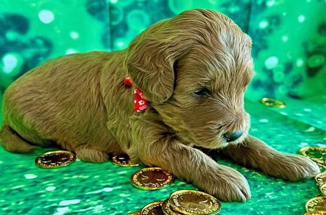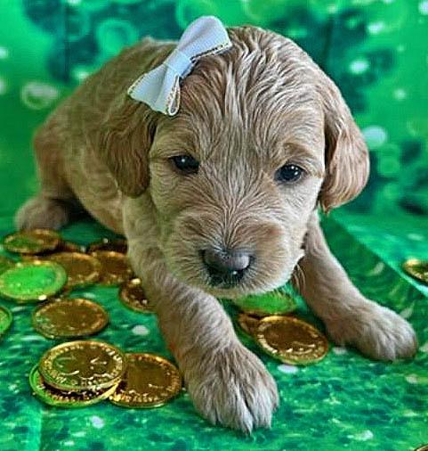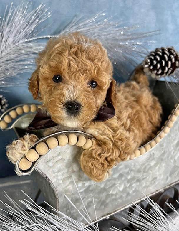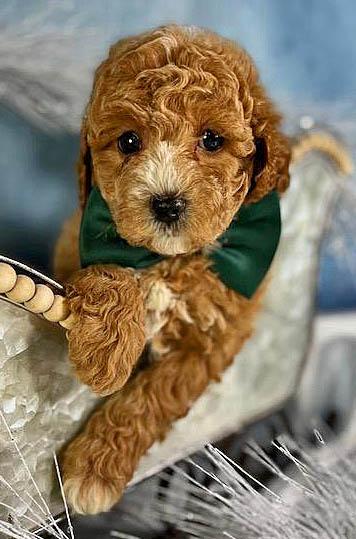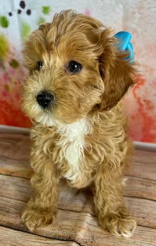 Bunty is an F1b Mini Goldendoodle who is beautiful and has a charming personality. She loves everyone, people and animals, and is always ready to play. She is on the smaller side for Mini Goldendoodles.