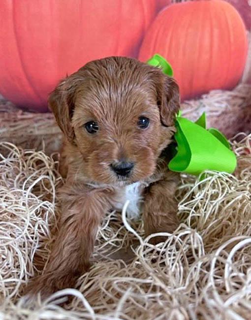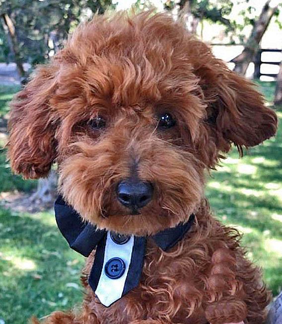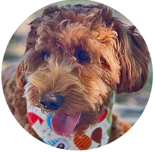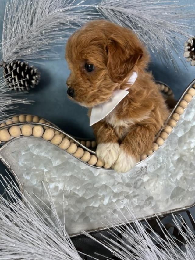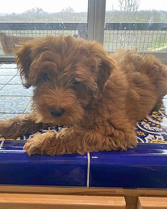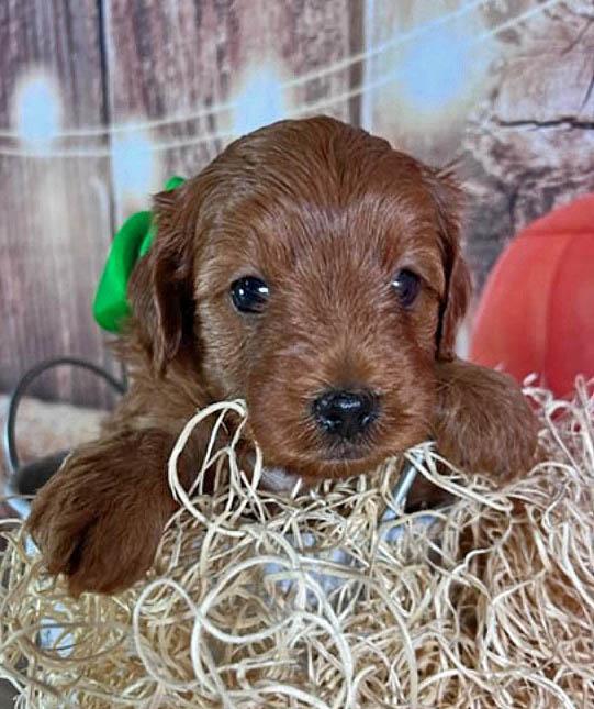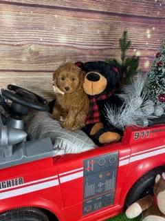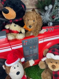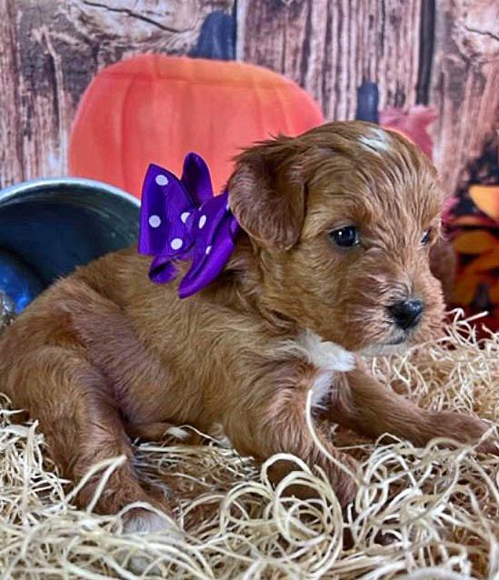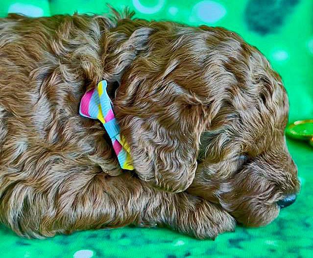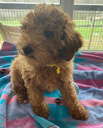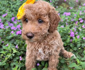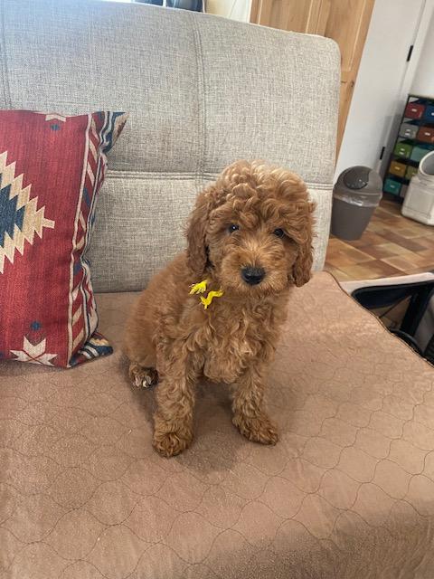 Milly is a pretty, dark red F1 Mini Goldendoodle. She has a sweet personality and gets along with everyone, humans and canines.