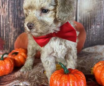 Pookie is a precious, sweet, super mellow Toy Poodle. He loves to snuggle in a lap, but his favorite activity is riding on our John Deere Gator. He likes to hang out with our Standard Poodle, Guv.