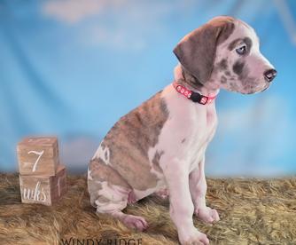 I'm Jill G., the breeder behind Windy Ridge Danes located in Lore City, OH. We offer well-rounded puppies who will excel in any adventure with their new family. Our primary focus is to produce dogs with strong working ability, solid temperaments, great health, and sound moderate structure. Our dogs work hard, play hard, love hard, and are part of the family.