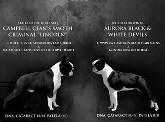 I am proud to be preserving the Purebred Bostons Terriers by breeding for standard color, traditional markings. Our Bostons come from Grand CH & CH lines. My sires & 1 female are imports (Serbia, Montenegro & Russia). Pedigree-Kennedy, Bewitching, T-Bo's, Sunwood. 1 of my studs sire is International CH Lincoln(lamburgini ) , & my other stud's sire Cameron Beauty Gremlins is WORLD & European CH.