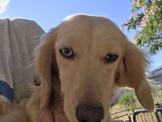 Sapphire is a beautiful ee cream dapple girl with one blue eye snd a gorgeous curly coat. She has Sniffintel bloodlines on both sides! She is also the most laid back girl 🩷