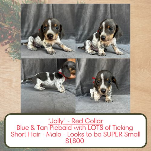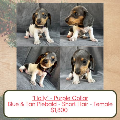 Our puppies include piebald, cream, blue and tan, fawn (isabella) and tan, chocolate and tan, black and tan, and dapple. Colors will vary depending on the parent dogs.