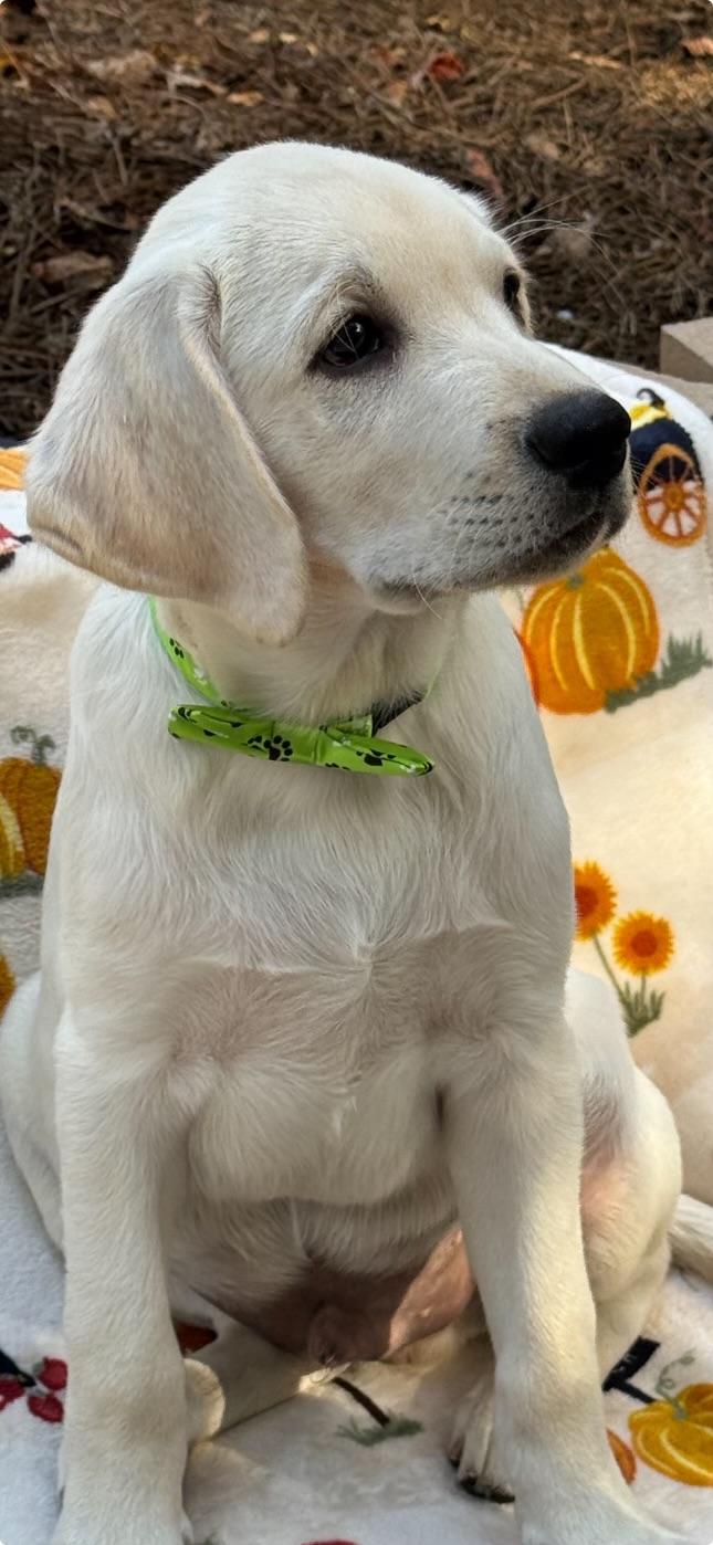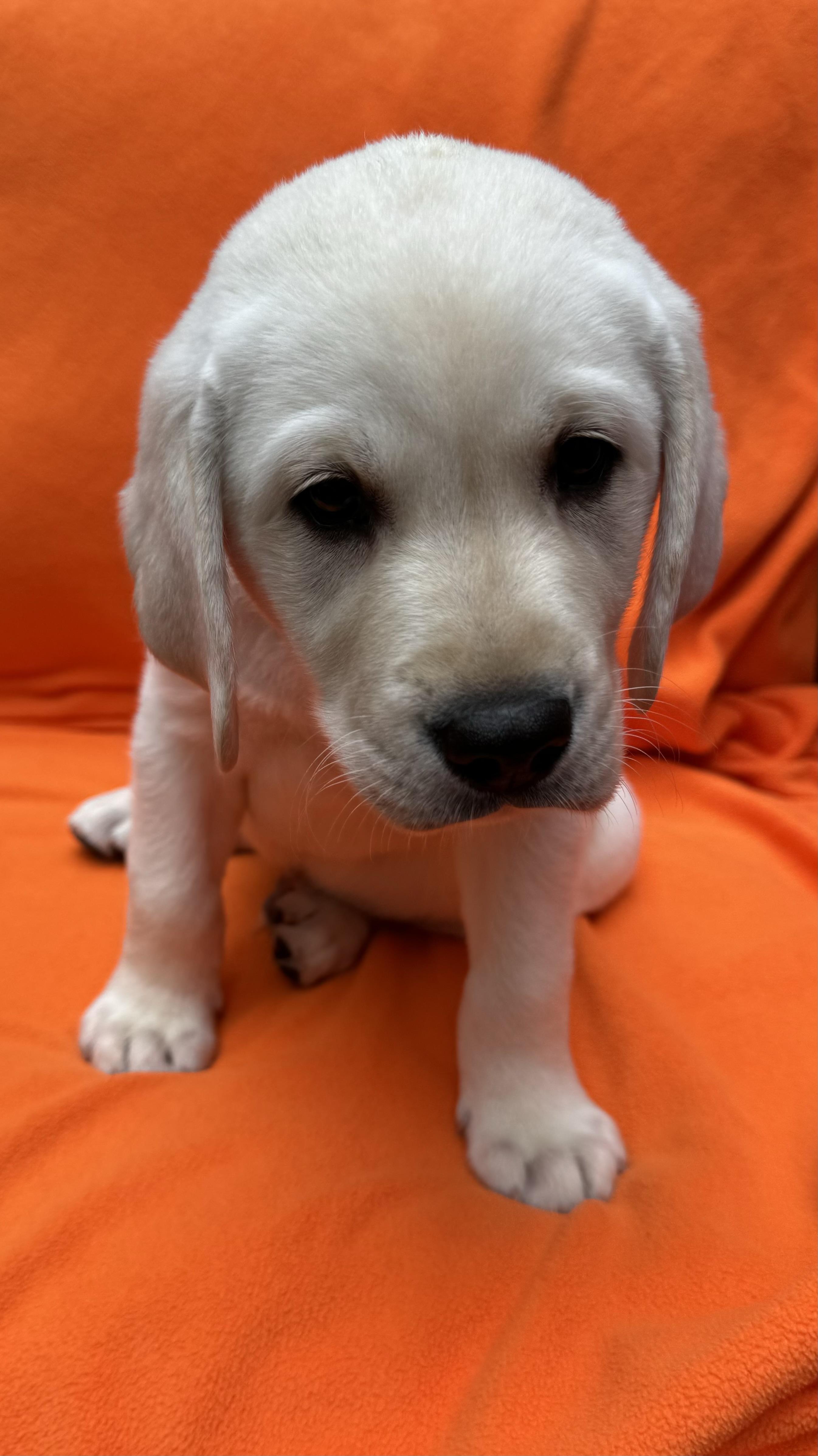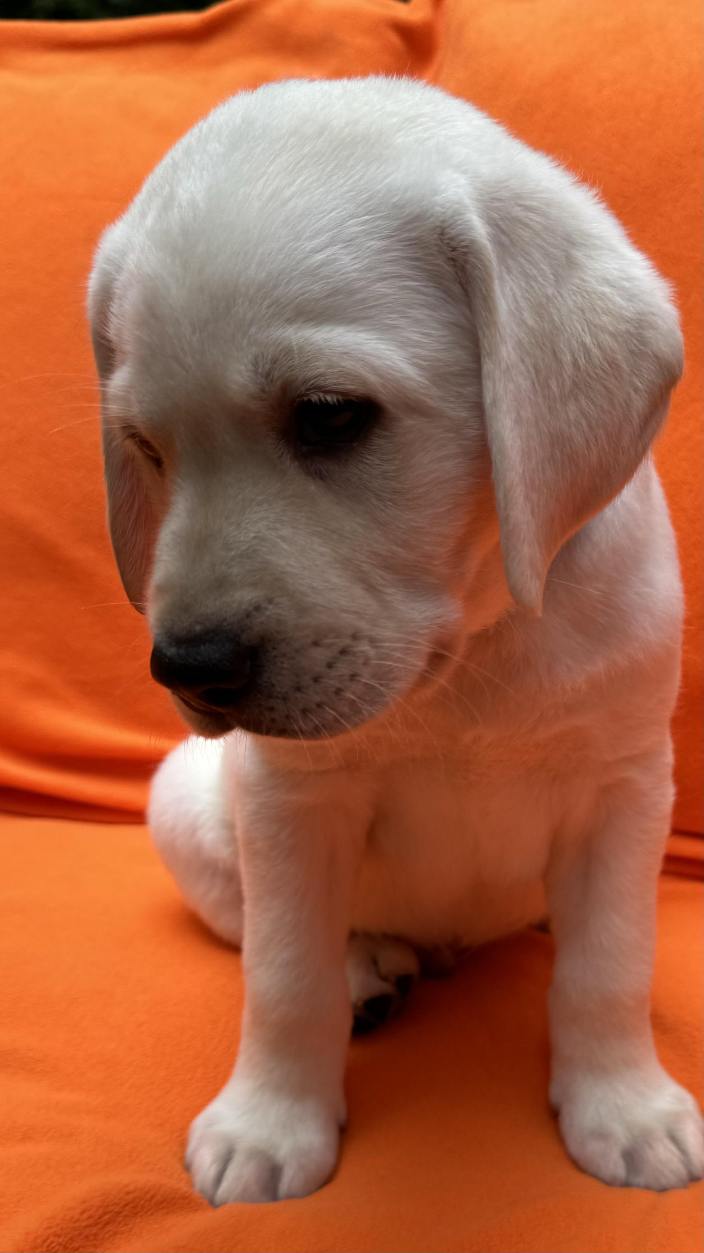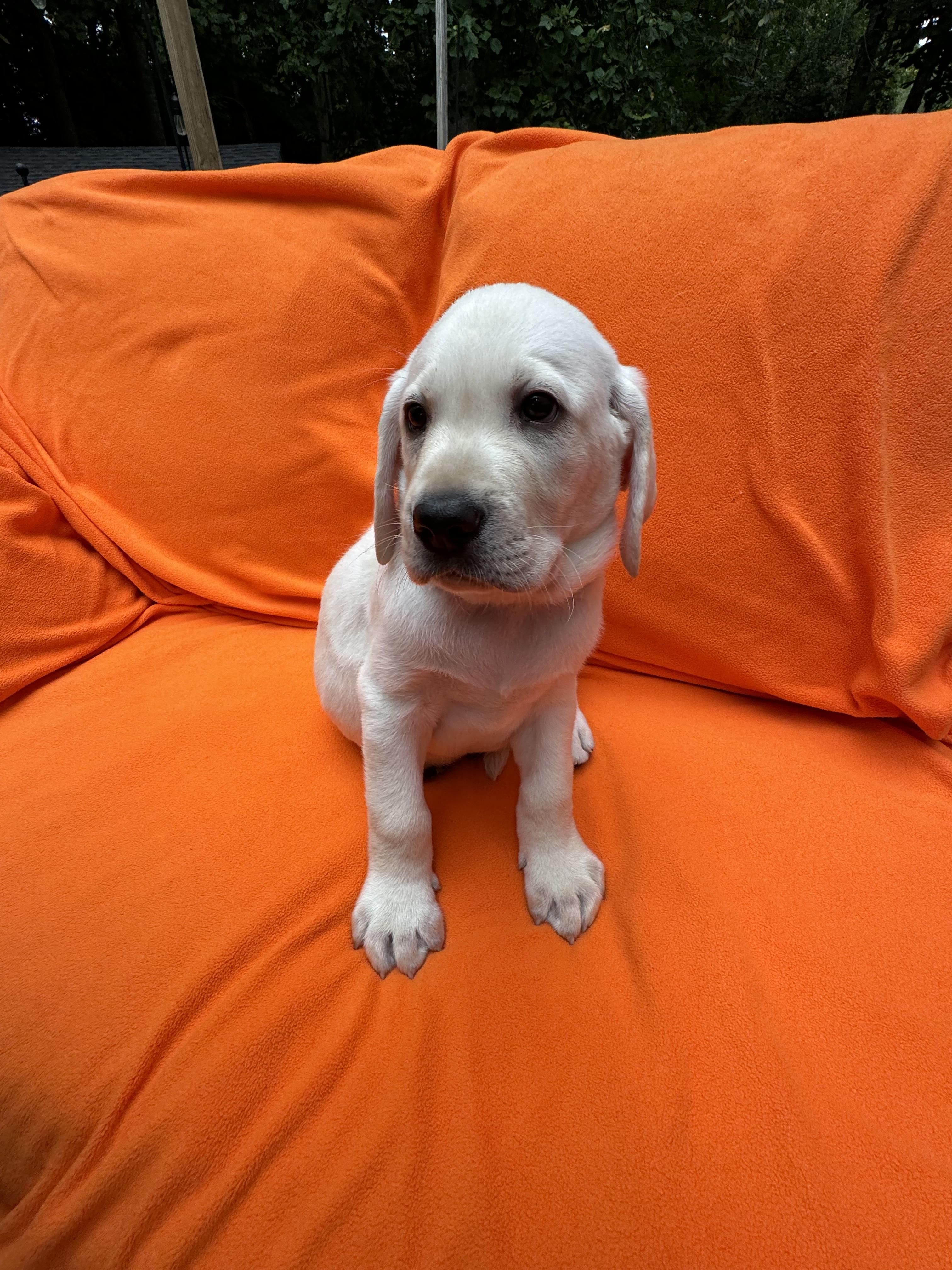 Skye is the calmest Lab you will ever meet. From champion show lines, she comes with a beautiful coat and shape, and chill demeanor. Loves to chase her sister around the yard but would rather come in and get belly rubs. Smart and loves to have a job (she picks up all the food dishes for us.) Her pups have all been playful but calmer than other litters.
