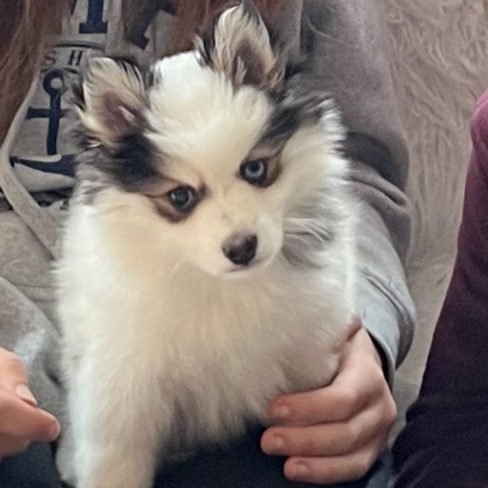 Winter is a stunning 12-lb black and white Pomsky with a personality as bright as her markings. Everywhere we go, she turns heads and steals hearts — it’s no surprise people stop me daily to compliment her!