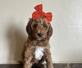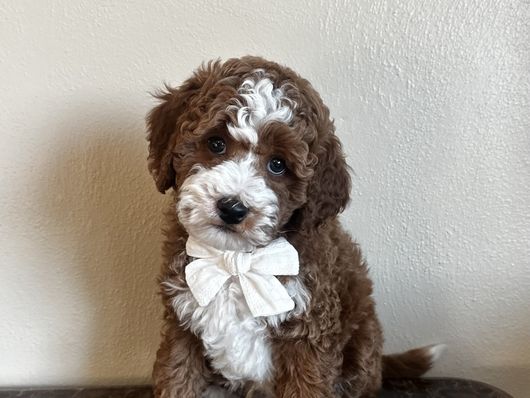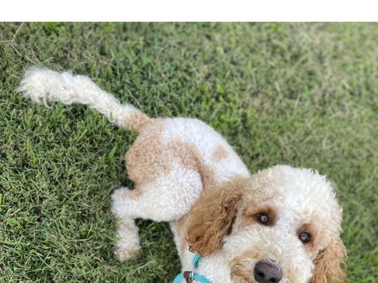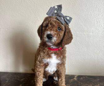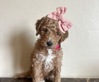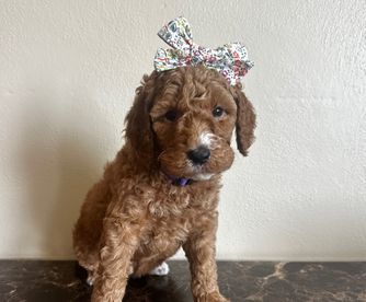 Lulu is gentle-natured & adores her humans. She is one of the smartest dogs that I have ever owned. Lulu enjoys walks, going on hikes, playing fetch, & showing off her tricks. She knows how to sit, roll over, shake, & speak. Lulu is a one-of-a-kind dog & has stolen everyone’s heart at Wischmeier’s Poodles & Doodles.