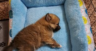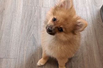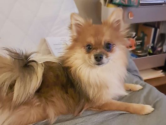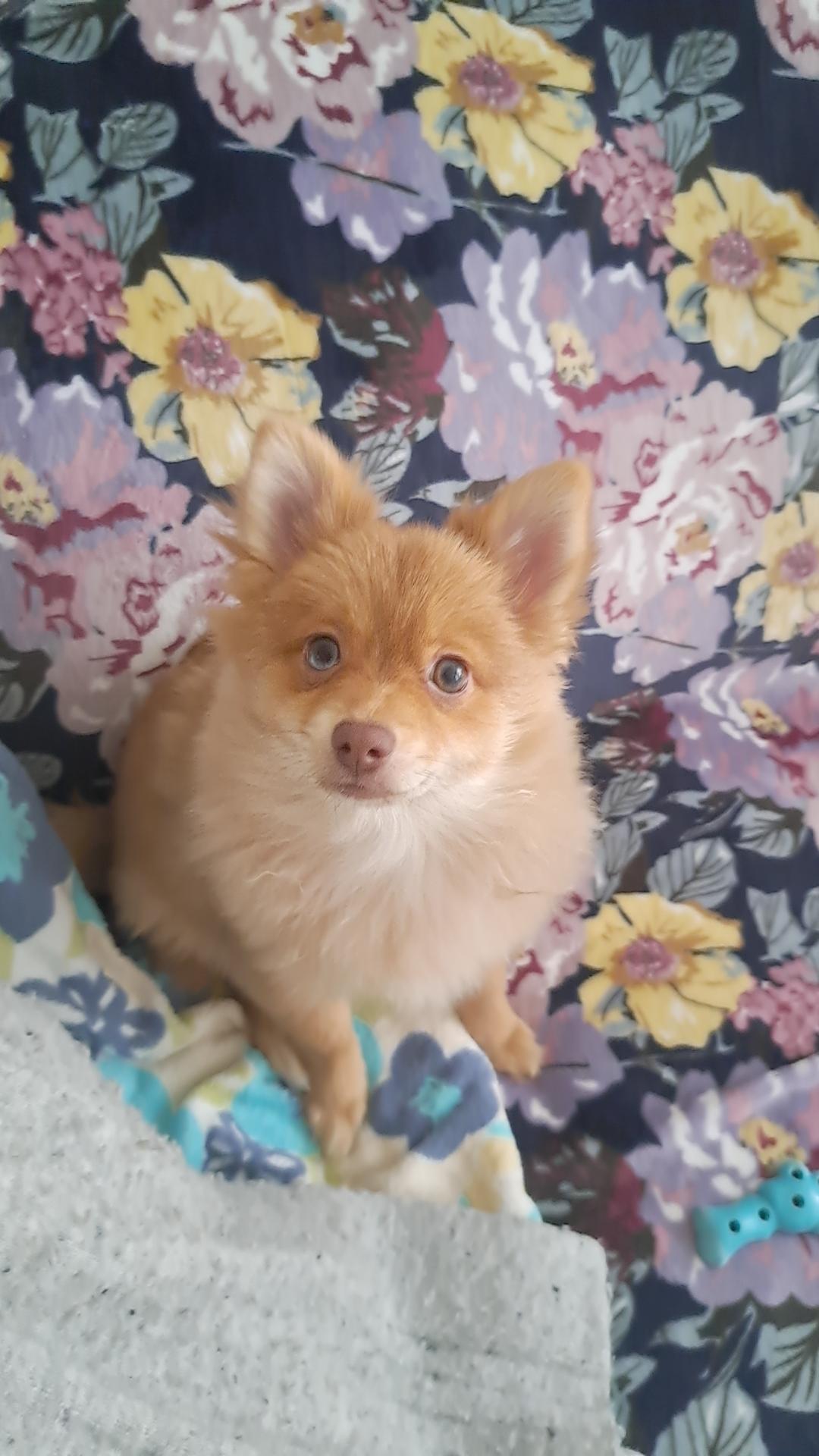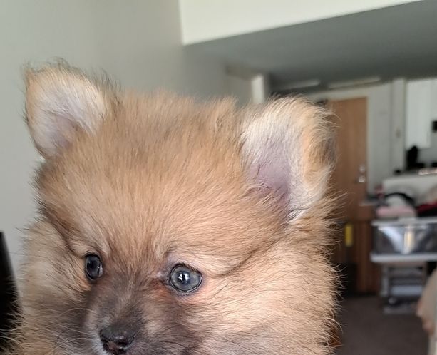 Gordon is an Orange merle pomeranian with light hazel, and blue eyes. He's the sweetest boy ever, is well behaved, and is always super smiley and ready to give kisses.