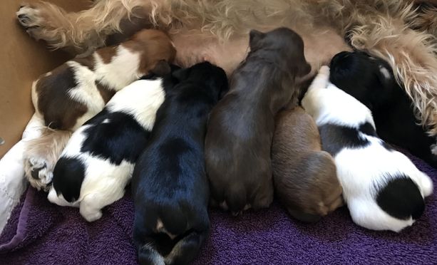Our puppies include chocolate and tan, gold, parti, blue and gold, and black and tan. Colors will vary depending on the parent dogs.
