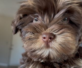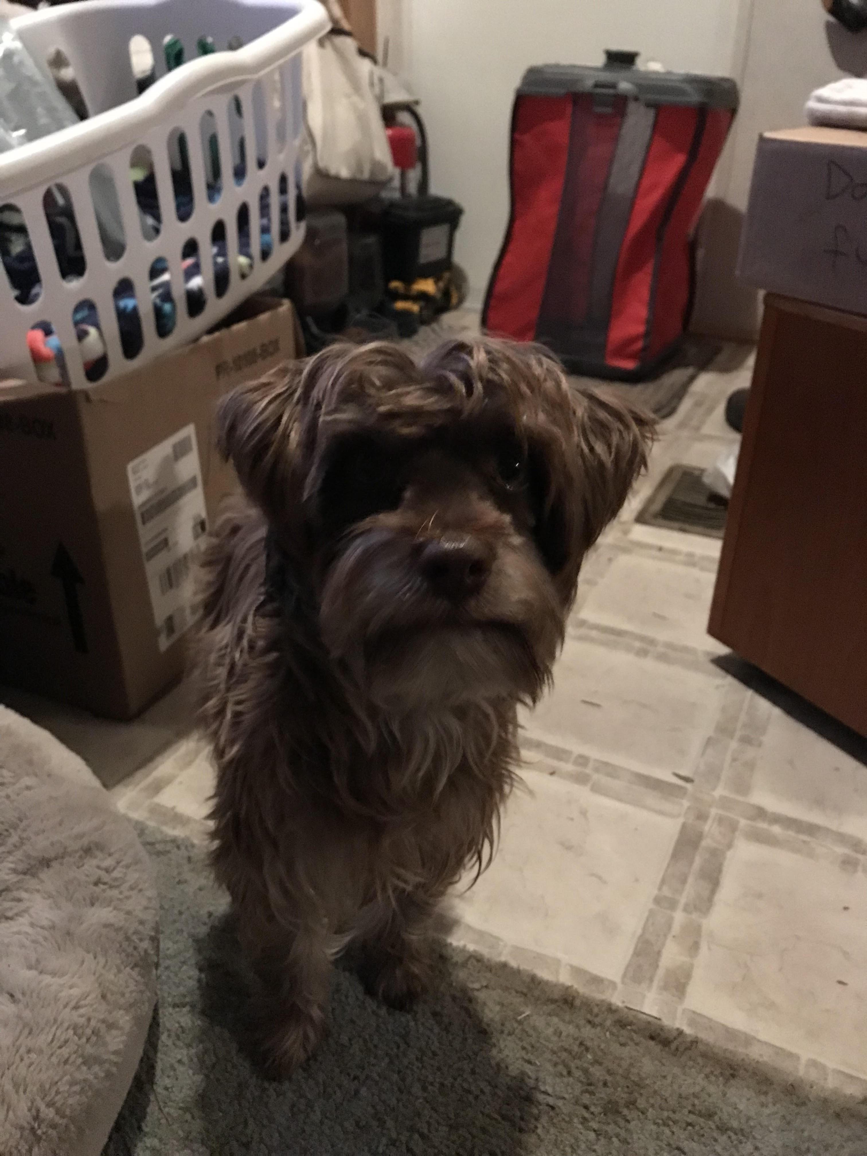 Barkley was such a solid dark chocolate that I flew to NC to get him, and I live in CA. He grew to have some white on his mustache area and oddly, he got a white patch under his tail, of all places. He is pretty submissive to some other small dogs, but will stand firm against bigger dogs coming around his things and his girlfriend.
